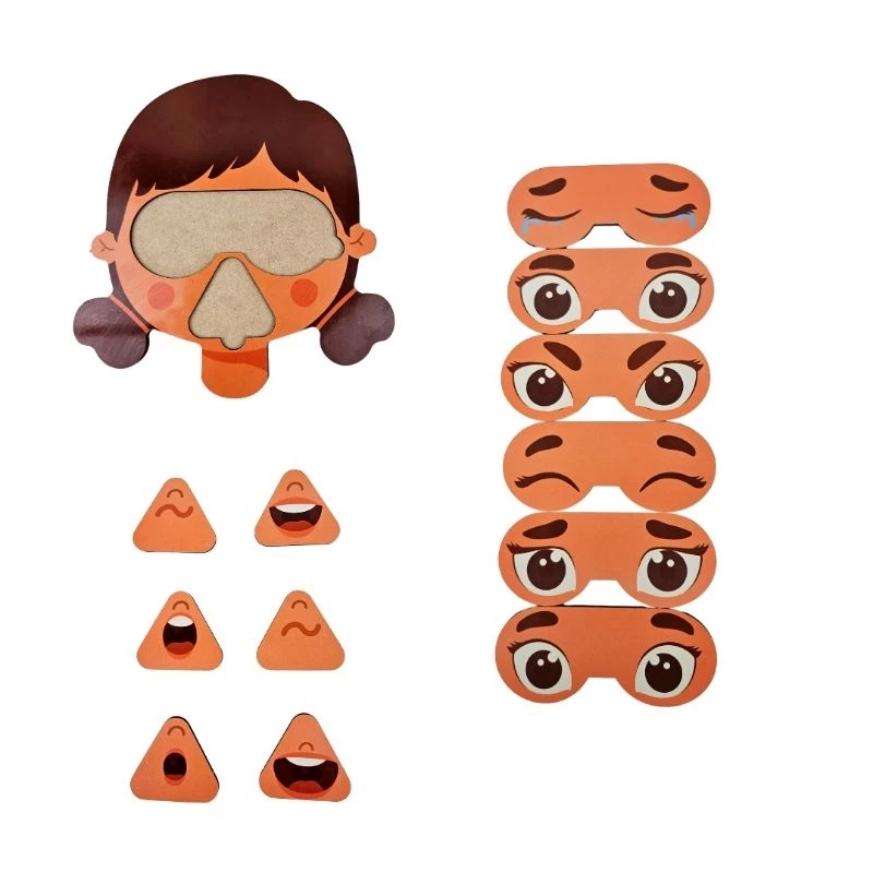 Este painel é composto por um rosto base e peças móveis que representam diferentes expressões. A criança pode trocar olhos, bocas e sobrancelhas para montar a carinha que expressa seu sentimento.