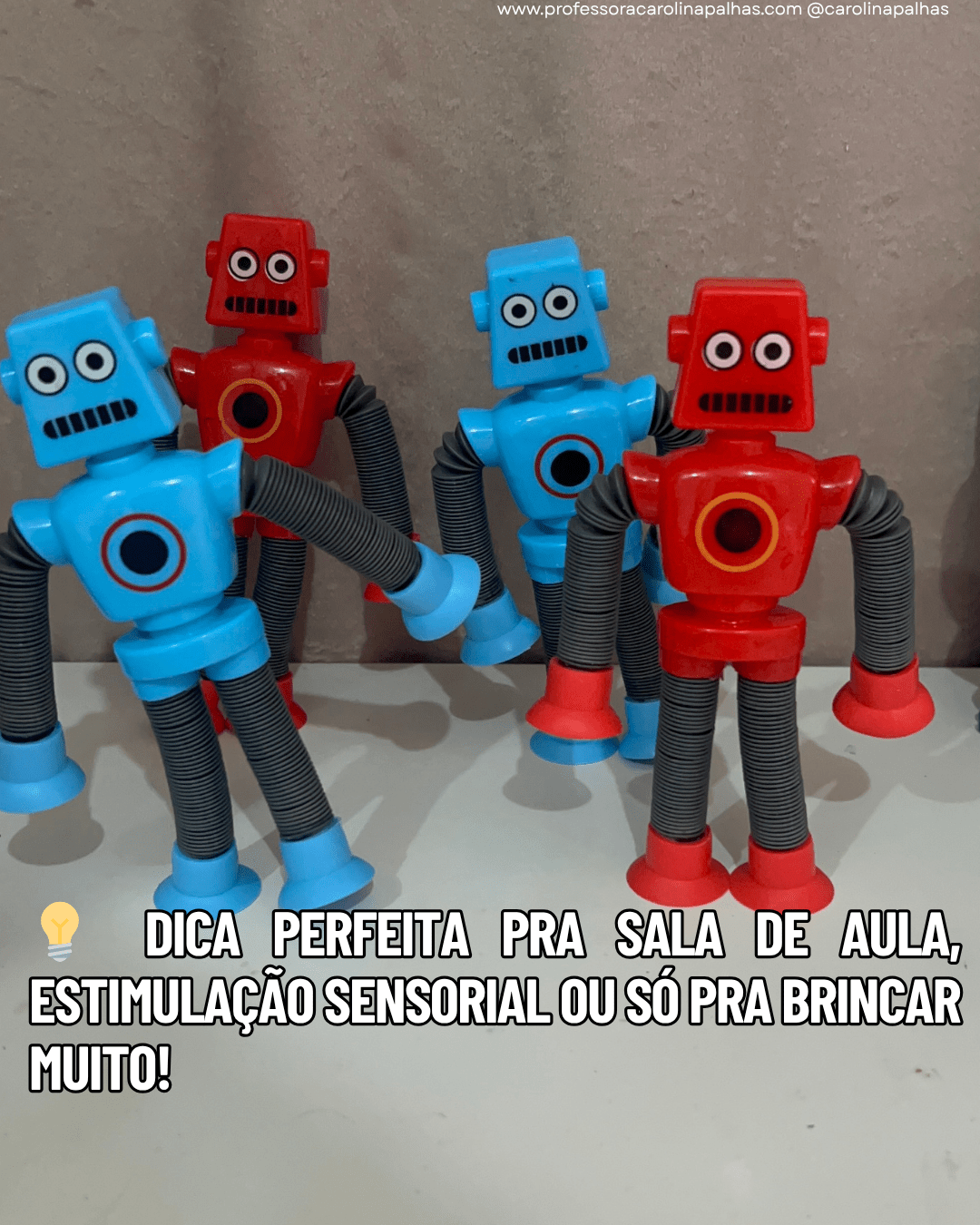 Esse brinquedo é um robô articulado, com estrutura flexível, que permite esticar os braços e pernas com efeito sanfona, tipo tubo pop it. Ele pisca luzes de LED quando movimentado e emite um som leve ao ser manipulado, estimulando a audição e a atenção. Além disso, ele é colorido, simpático e resistente — ideal para o uso constante em sala de aula, consultório ou em casa.
