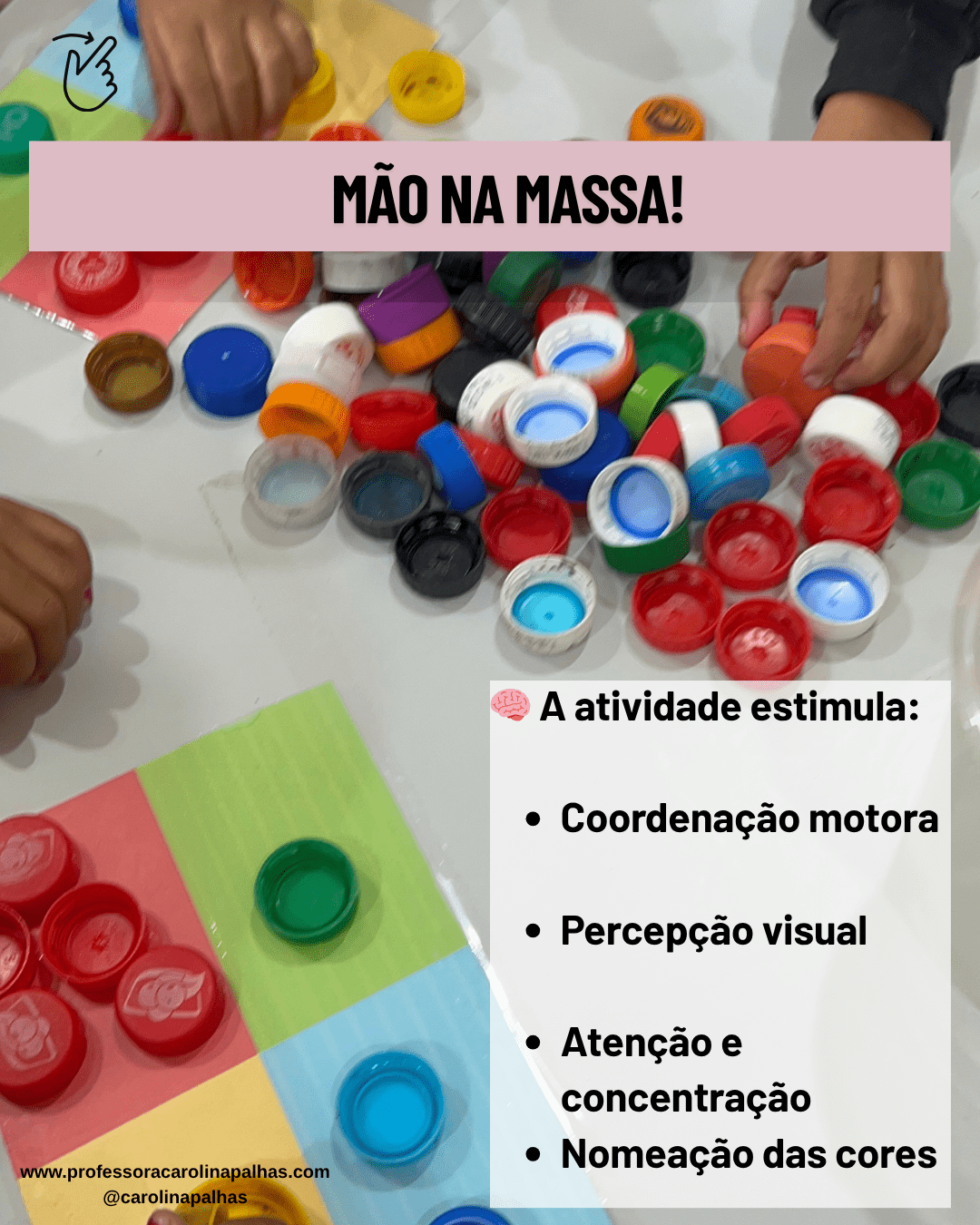 • Coordenação motora fina: manipular e posicionar as tampinhas exige movimentos precisos e controle muscular