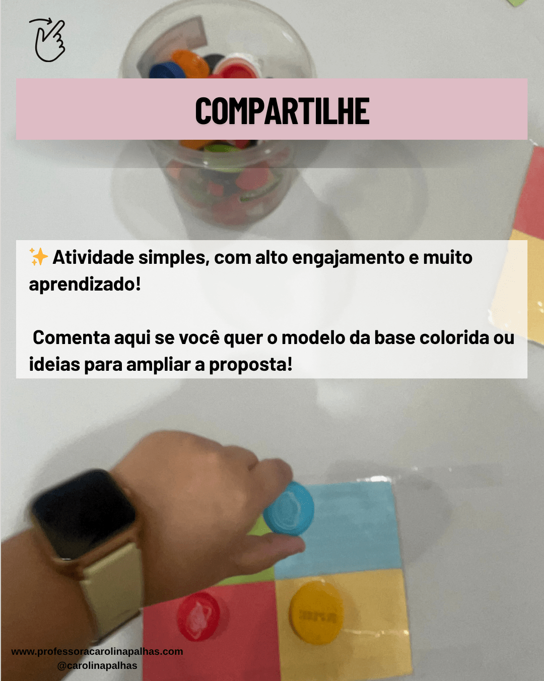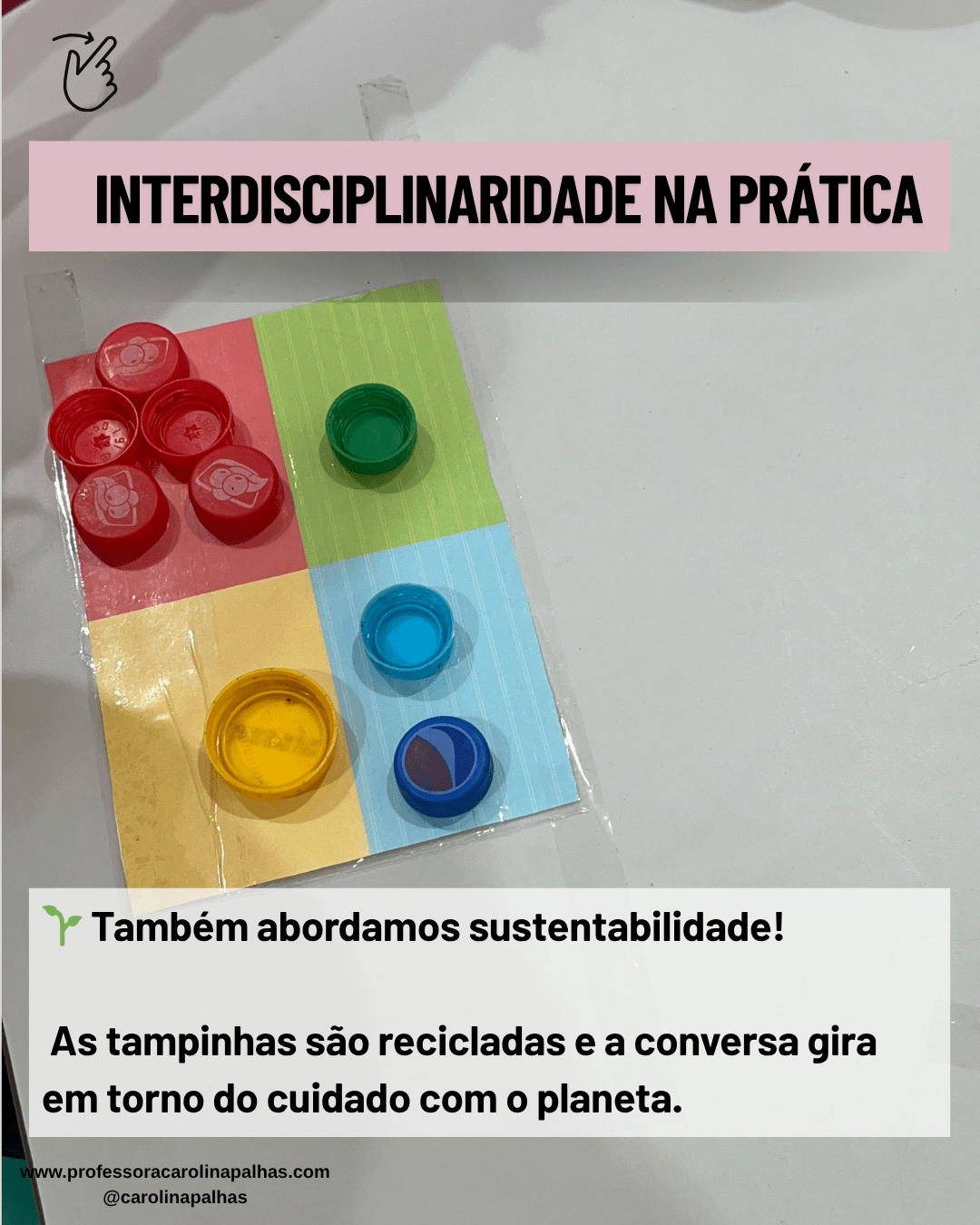palavras-chave: atividade com tampinhas, educação infantil, cores na educação infantil, coordenação motora fina, BNCC na prática, reciclagem criativa, nomeação de cores, percepção visual, sustentabilidade na escola