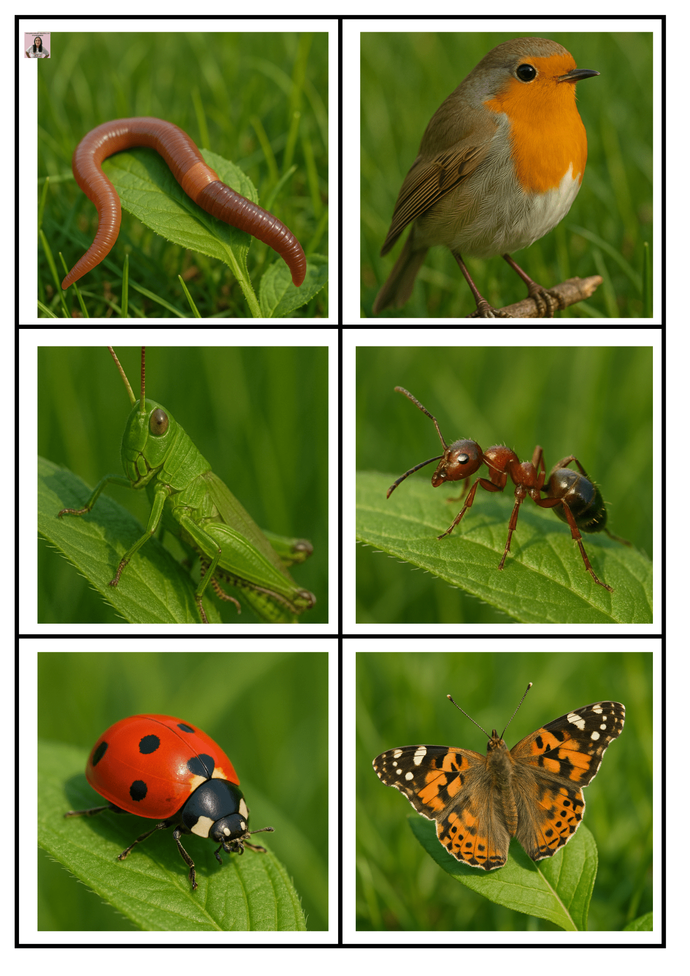 Cartela impressa com 6 animais: joaninha, formiga, abelha, minhoca, borboleta e grilo.