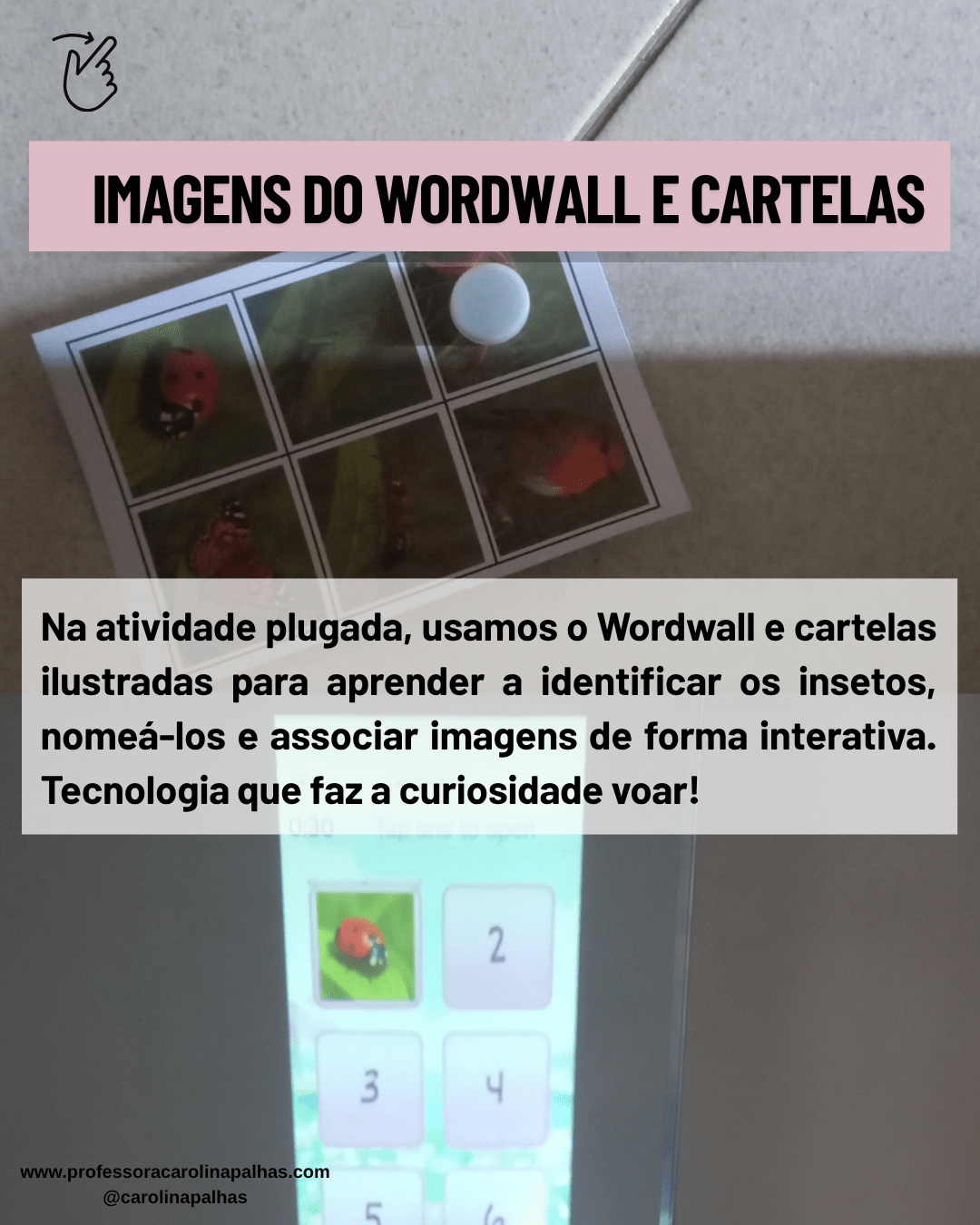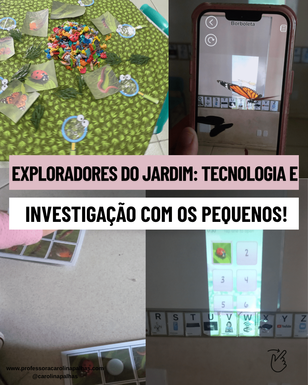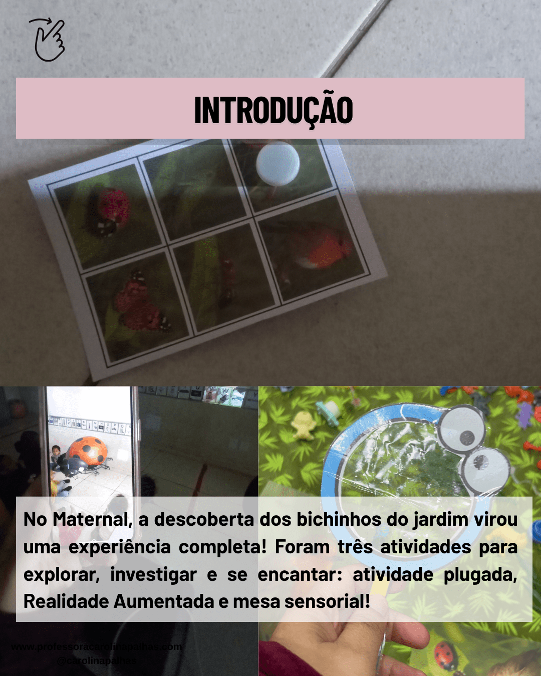 Palavras-chave: bichinhos do jardim, tecnologia na educação infantil, mesa sensorial, realidade aumentada, Wordwall, atividades plugadas, atividades desplugadas, cantinho tecnológico, BNCC, mini cientistas, plano de aula, professores de educação infantil, aprendizagem lúdica, cultura digital, exploração sensorial, investigação infantil, atividades criativas, app AR Insects, insetos em realidade aumentada.
