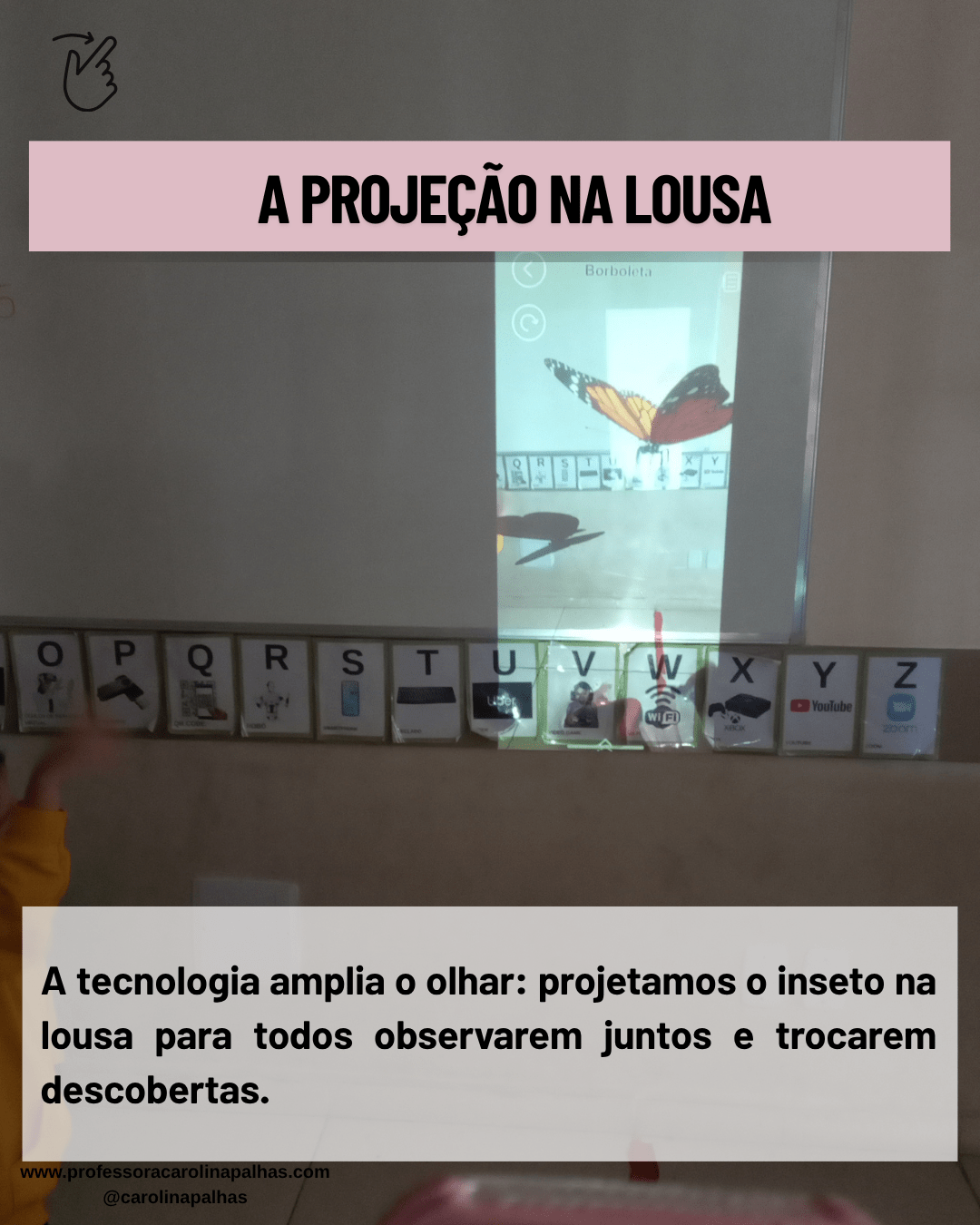 A segunda fase da atividade foi ampliar o campo de visão. Com um projetor ou mesmo conectando o celular à televisão da sala, levei a borboleta em RA para a lousa. A projeção em grande escala permite observação coletiva, discussões em grupo e comparação com imagens reais de borboletas.