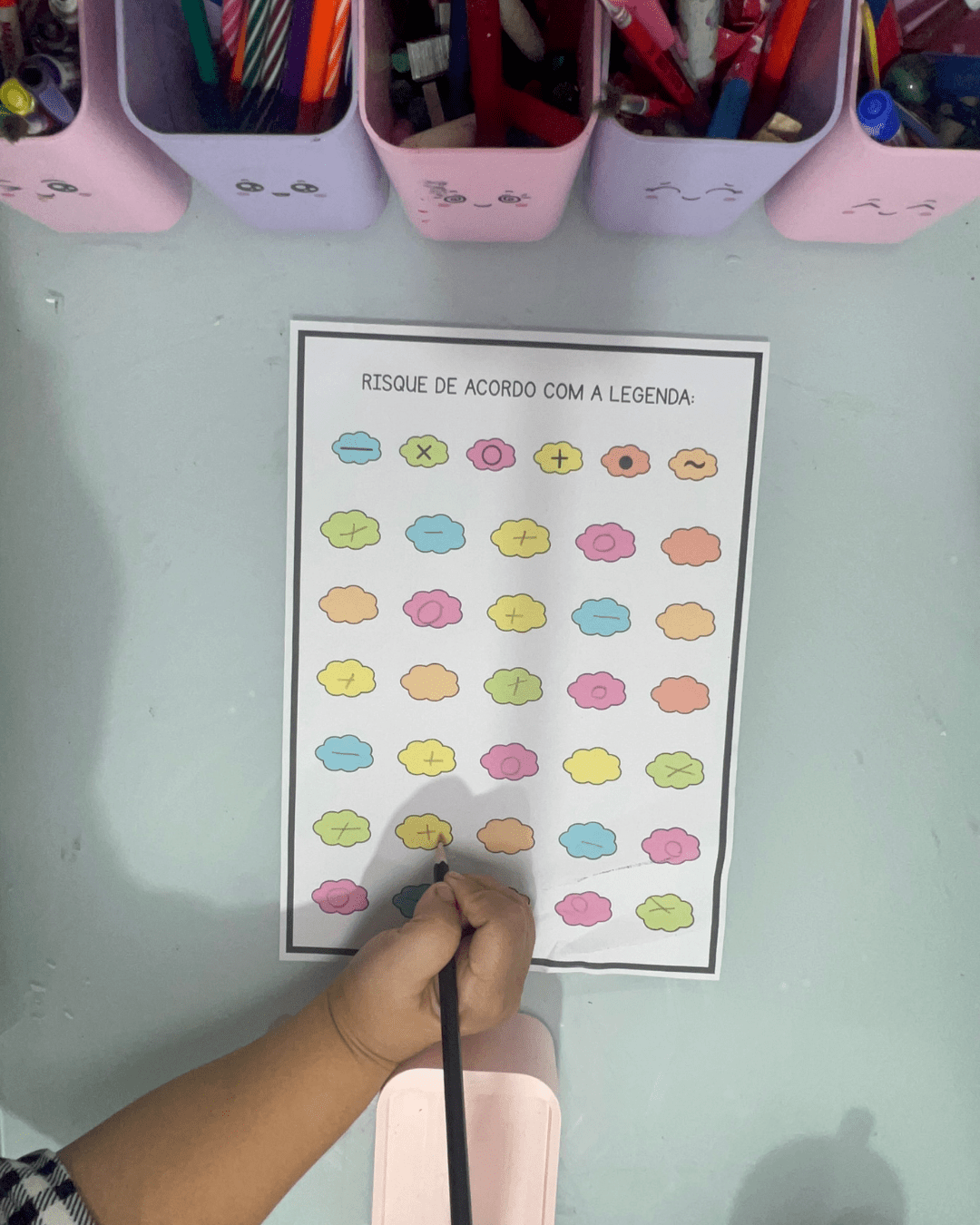 2️⃣ Explique para as crianças: cada nuvem colorida tem um símbolo correspondente na legenda — elas devem riscar o símbolo certo na nuvem certa;