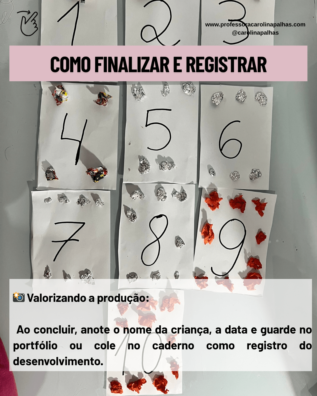📌 Ao finalizar cada numeral, anote o nome da criança, a data e faça um comentário positivo sobre o trabalho. Esse registro pode ser fixado no portfólio, no mural da sala ou enviado às famílias, reforçando a importância da participação e o orgulho da produção.