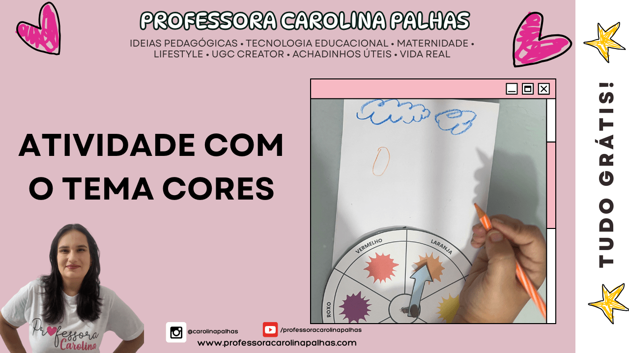 Eu, Professora Carolina Palhas, preparei uma atividade exclusiva, gratuita e super divertida, que vai facilitar sua rotina pedagógica e encantar as crianças: a ATIVIDADE COM O TEMA CORES, disponível para download 100% grátis no meu blog.
