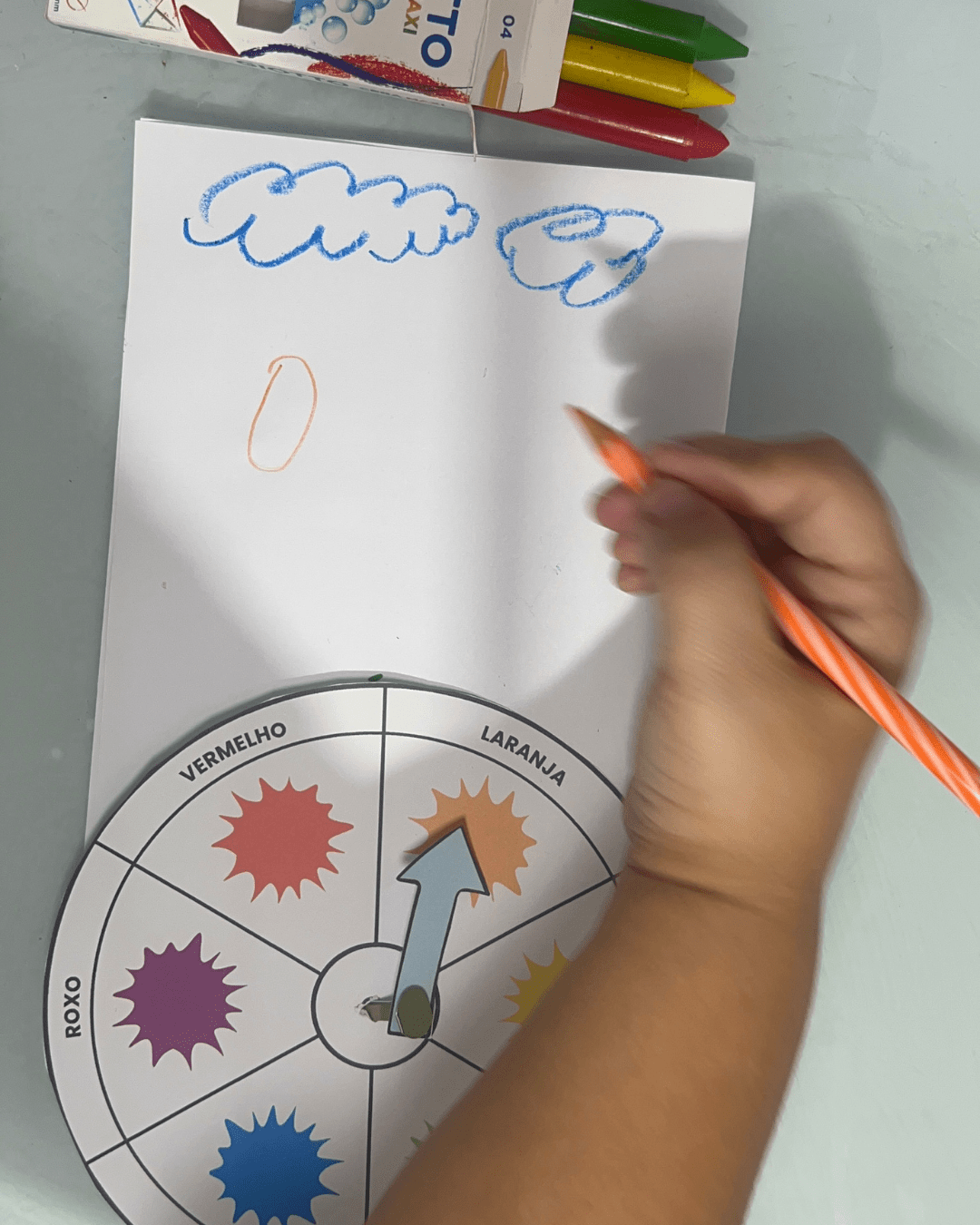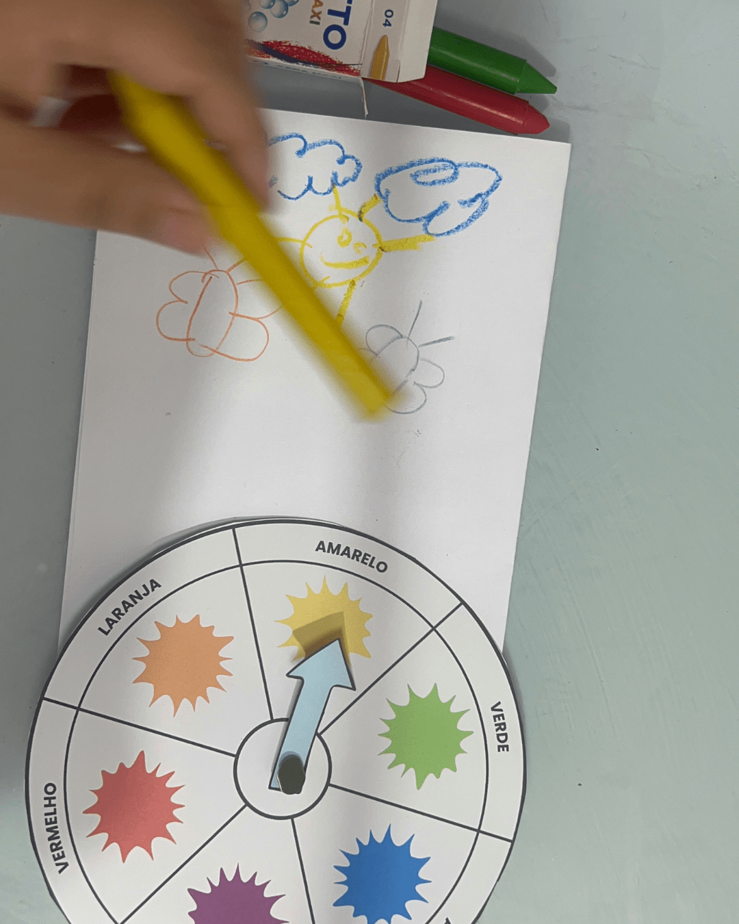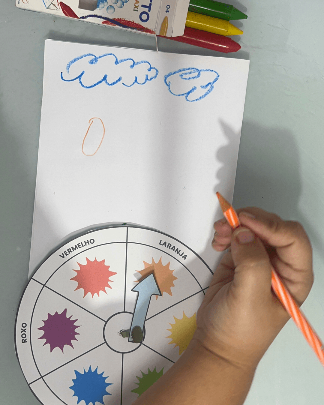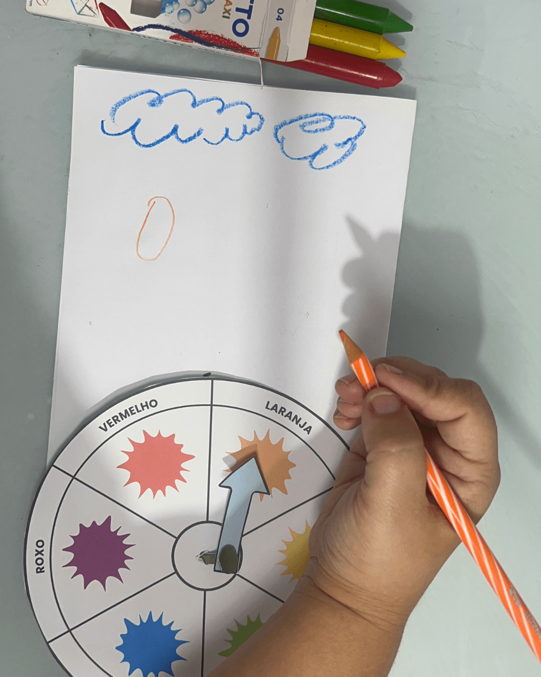 2️⃣ Explique para a criança o objetivo: combinar o giz de cera com o desenho da mesma cor.