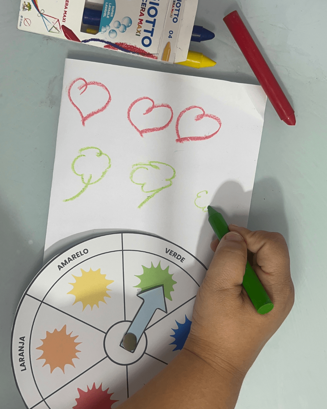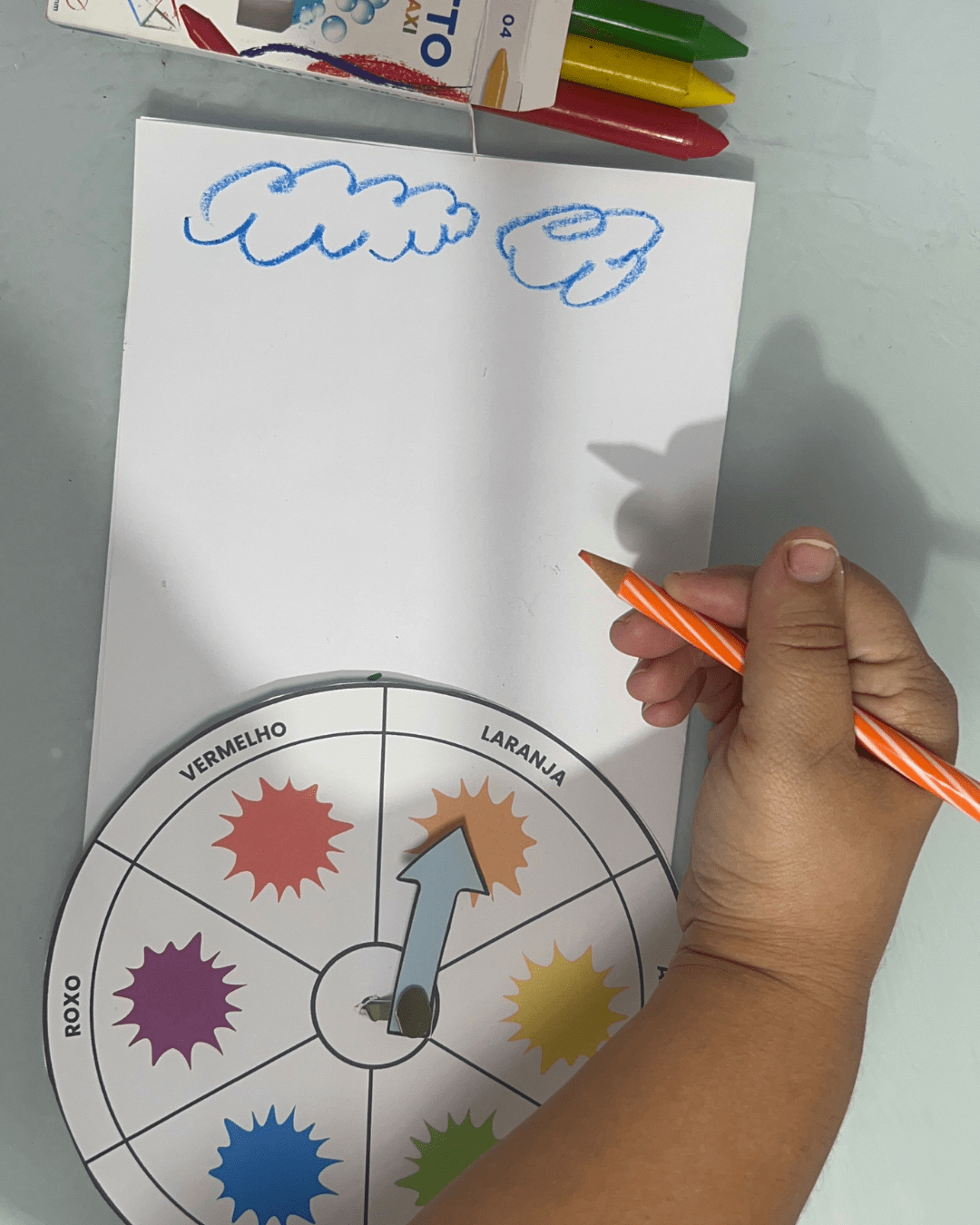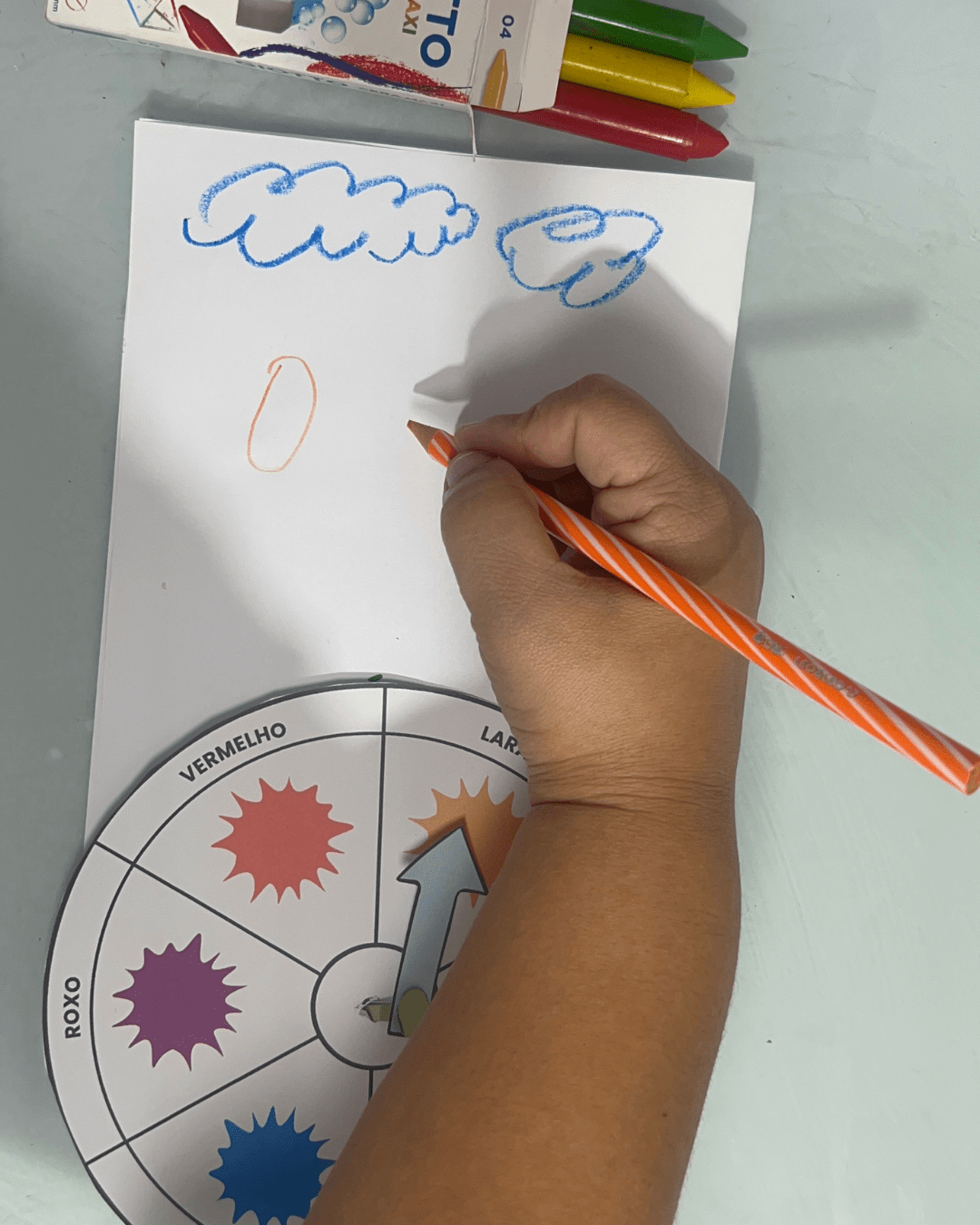 2️⃣ Explique para a criança o objetivo: combinar o giz de cera com o desenho da mesma cor.