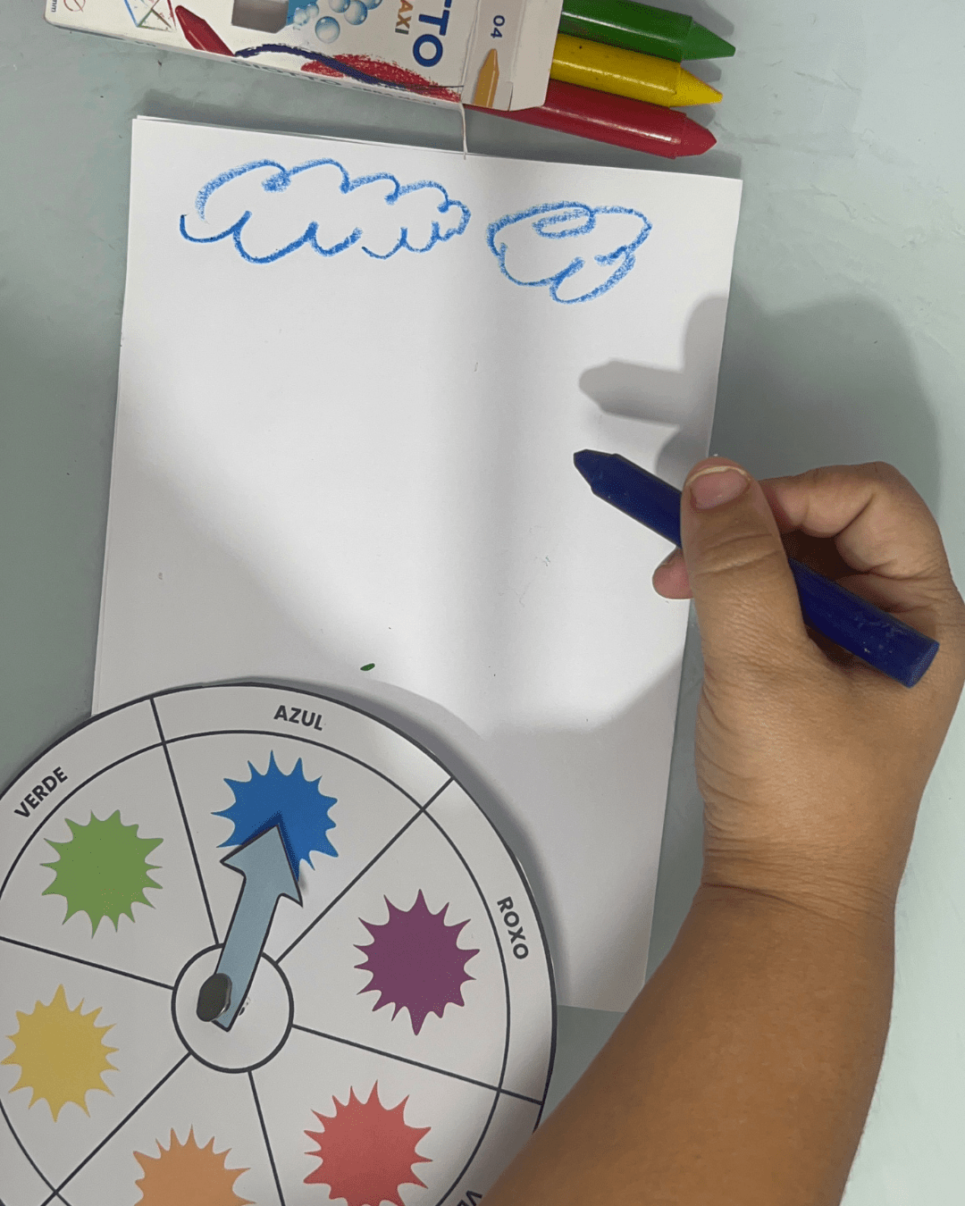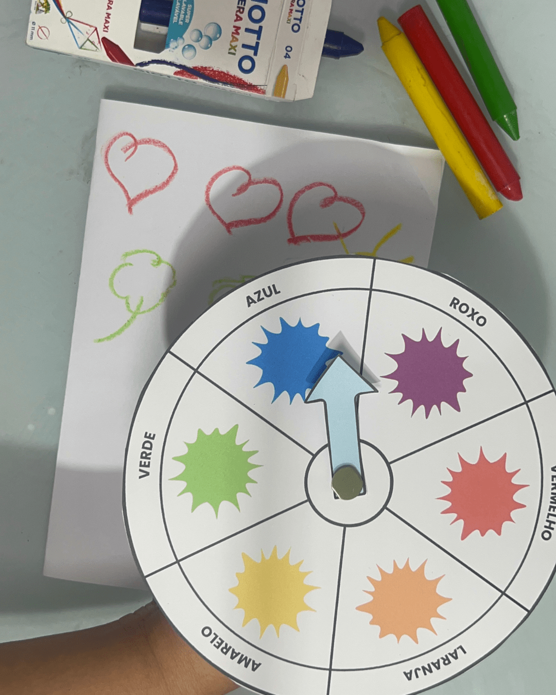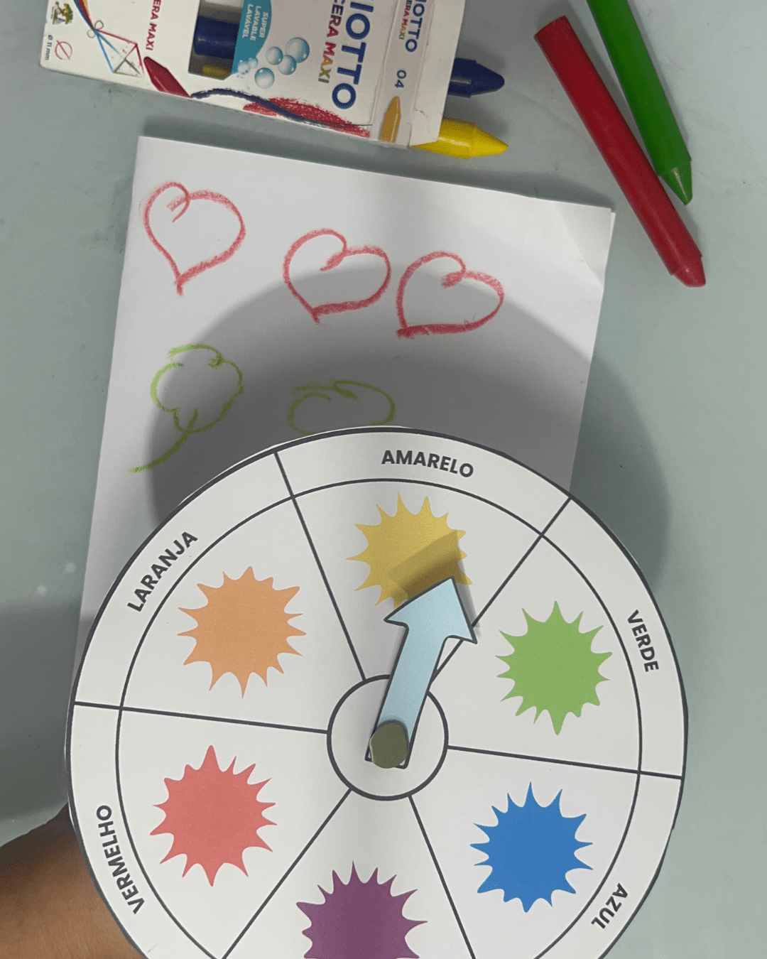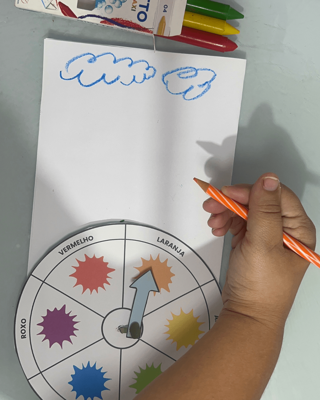2️⃣ Explique para a criança o objetivo: combinar o giz de cera com o desenho da mesma cor.