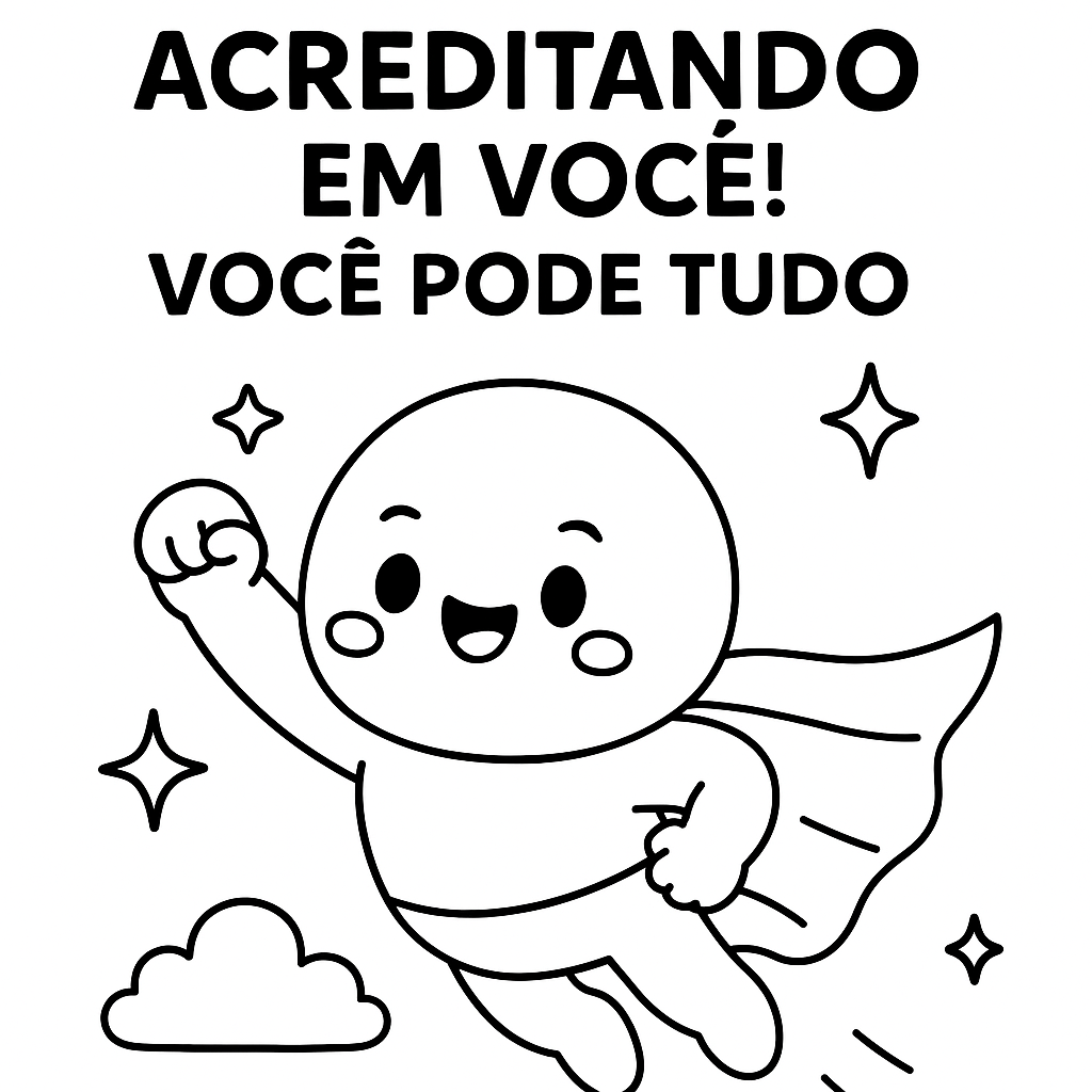 Essa frase empoderadora ajuda a criança a confiar nas próprias capacidades. O Bobygudy voando com capa de super-herói simboliza coragem e superação.