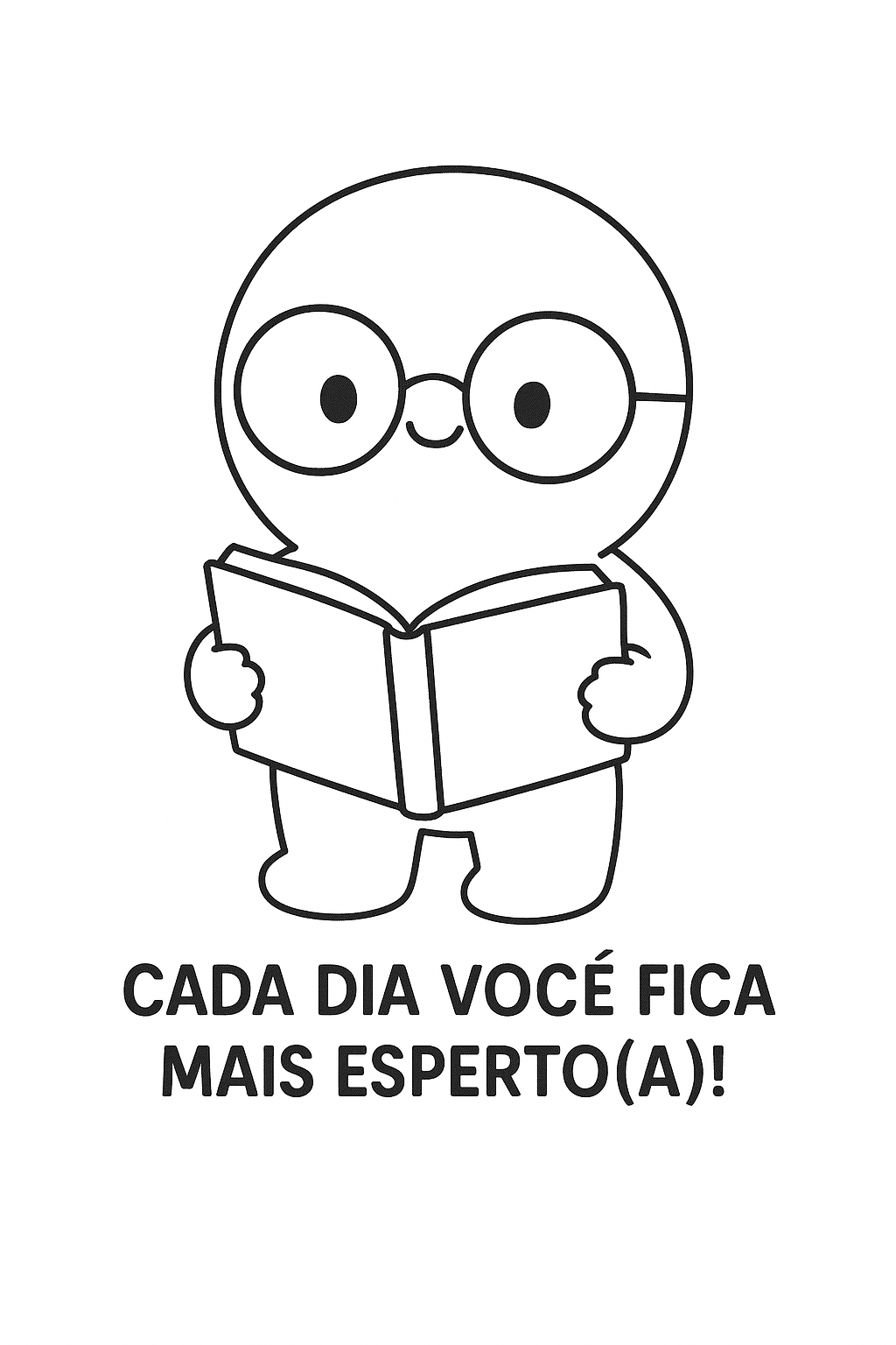 O Bobygudy de óculos com um livro aberto inspira curiosidade e aprendizado. Essa frase mostra que a criança evolui a cada dia.