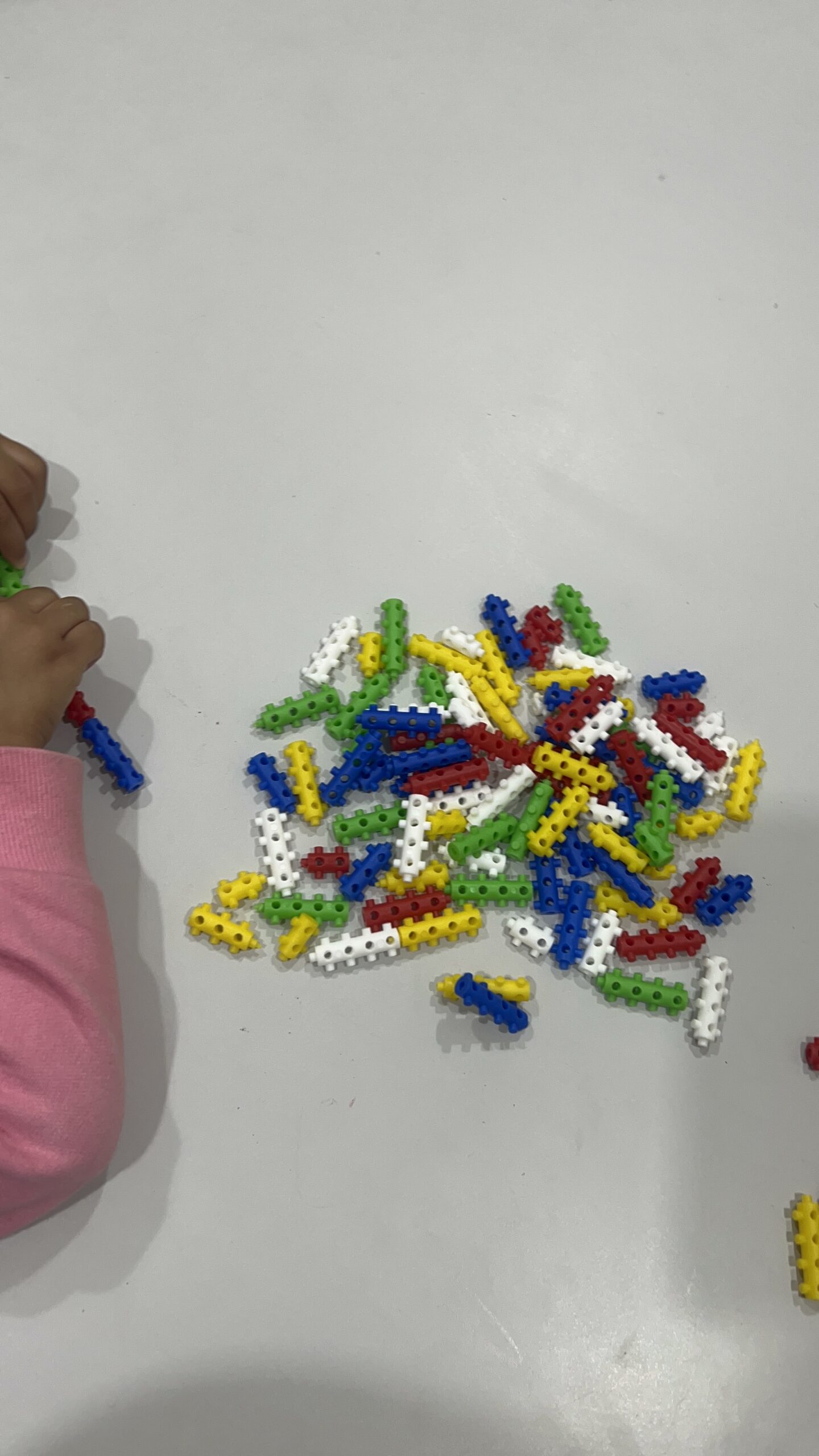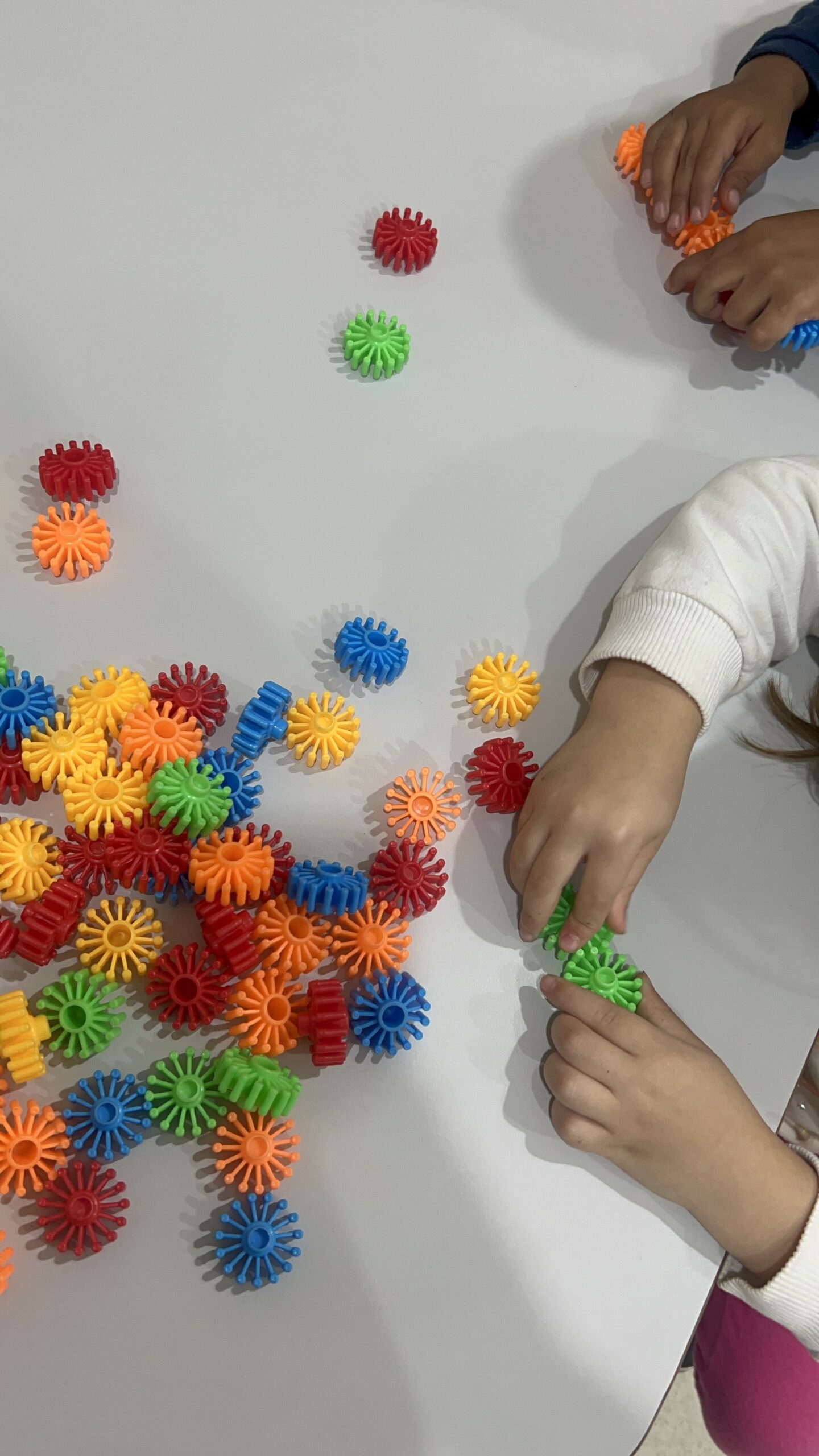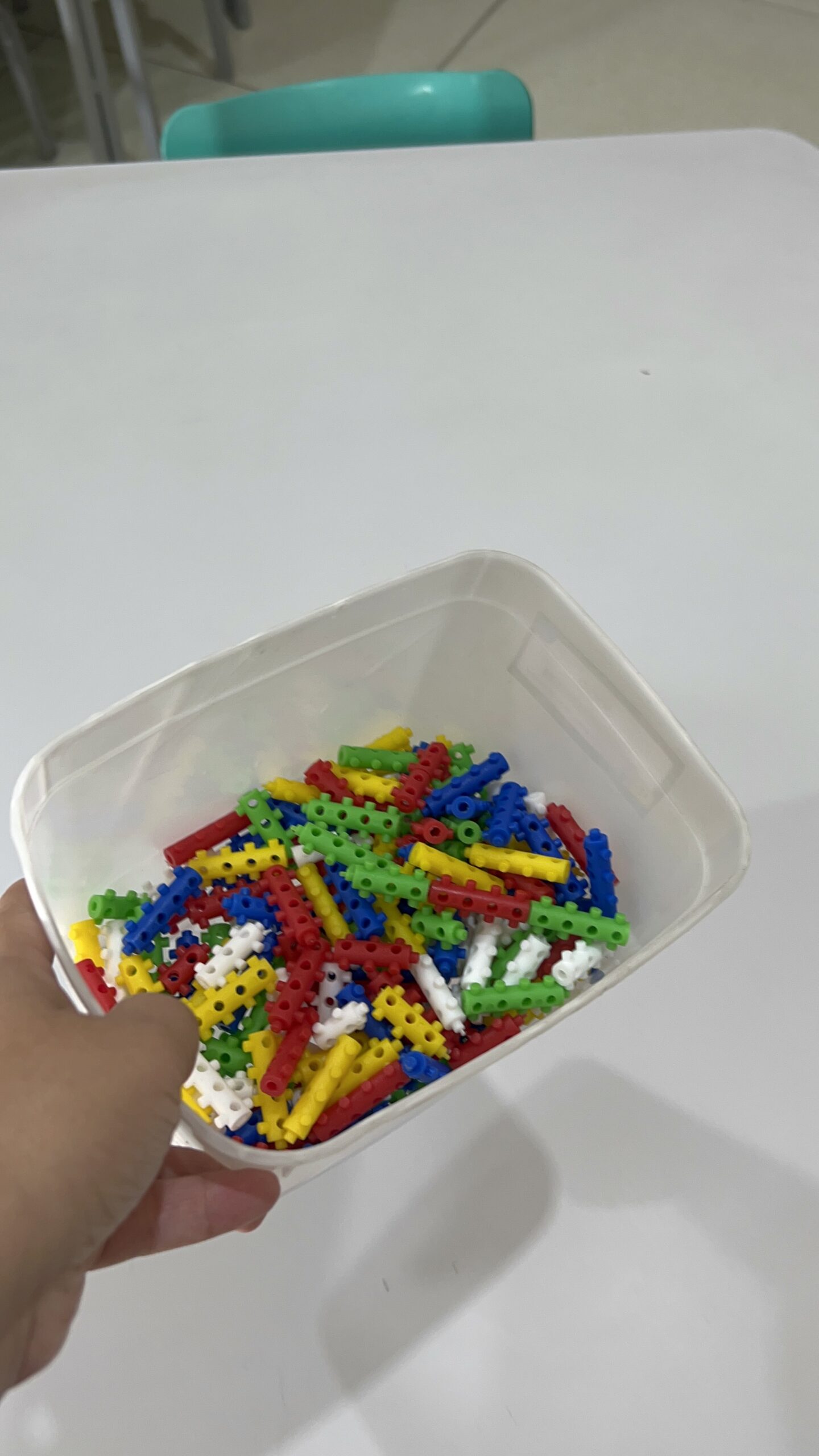 Na minha sala, costumo deixar os conectores disponíveis no cantinho de exploração livre. Também uso em atividades dirigidas para trabalhar temas como cores, contagem e sequências. Outra possibilidade é propor desafios: “Quem consegue montar uma torre com cinco peças de cores diferentes?”