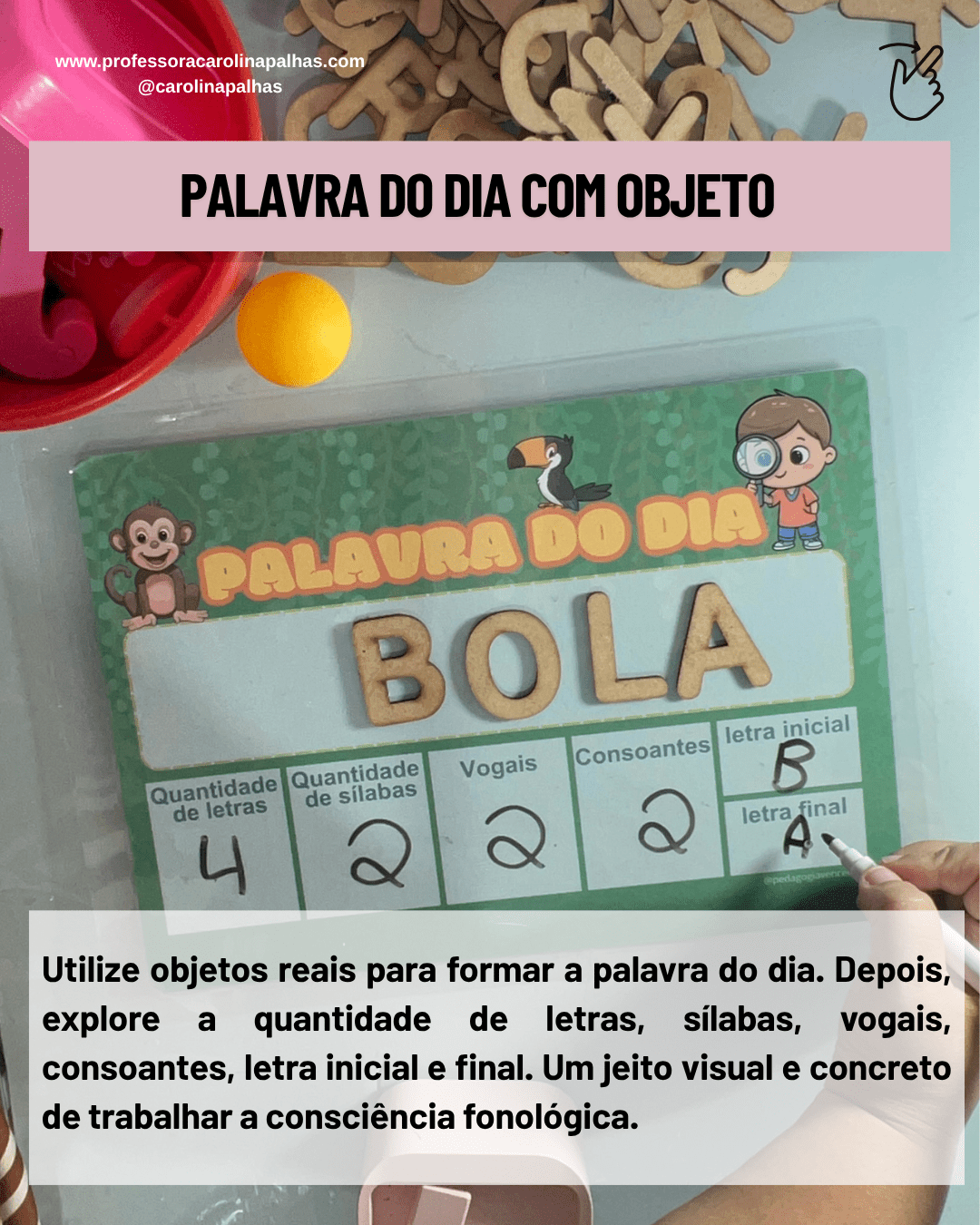 Nessa atividade, selecionamos um objeto do cotidiano da criança (como uma bola, por exemplo) e usamos esse objeto para formar a palavra do dia. No painel, montamos a palavra com letras móveis ou escritas com caneta e exploramos seus elementos: quantidade de letras, quantidade de sílabas, vogais, consoantes, letra inicial e letra final.