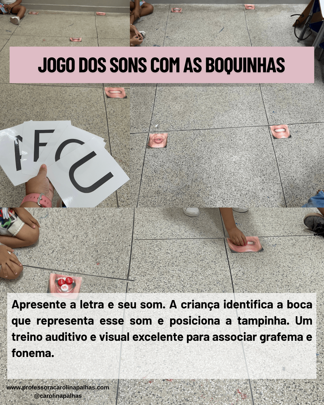 Nessa proposta, apresentei a letra em destaque (por exemplo, o “B”) e fiz o som articulado para a turma. Cada criança tinha uma cartela com boquinhas ilustradas. Ao identificar o som que eu emitia, elas deveriam posicionar uma tampinha sobre a boquinha correspondente.