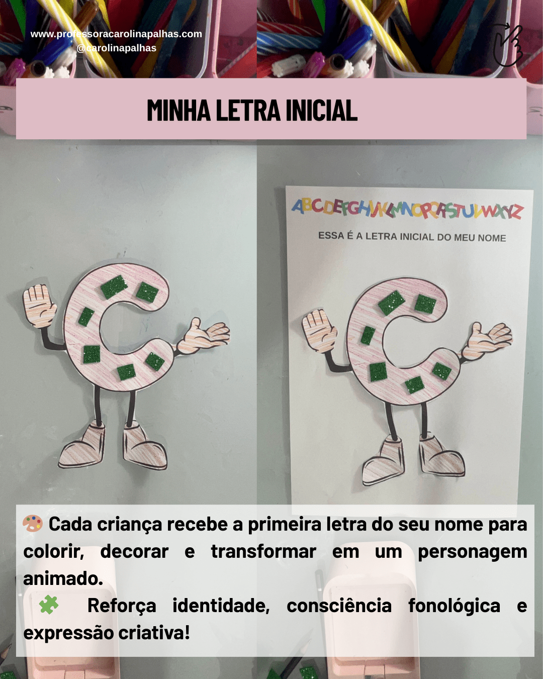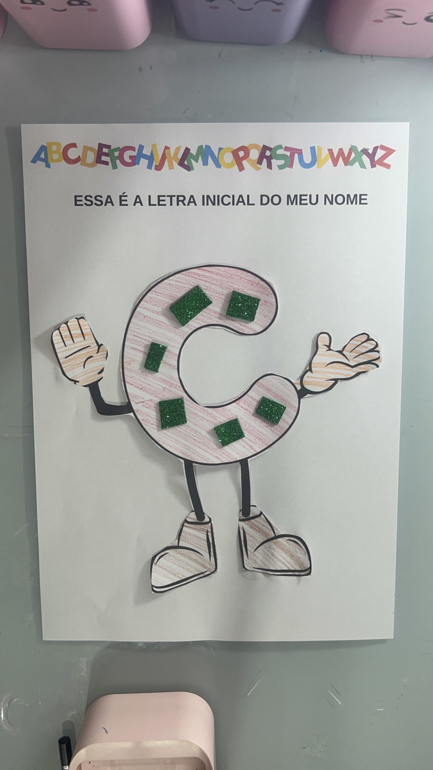 Cada criança recebe a primeira letra do seu nome para colorir, decorar e transformar em um personagem animado.