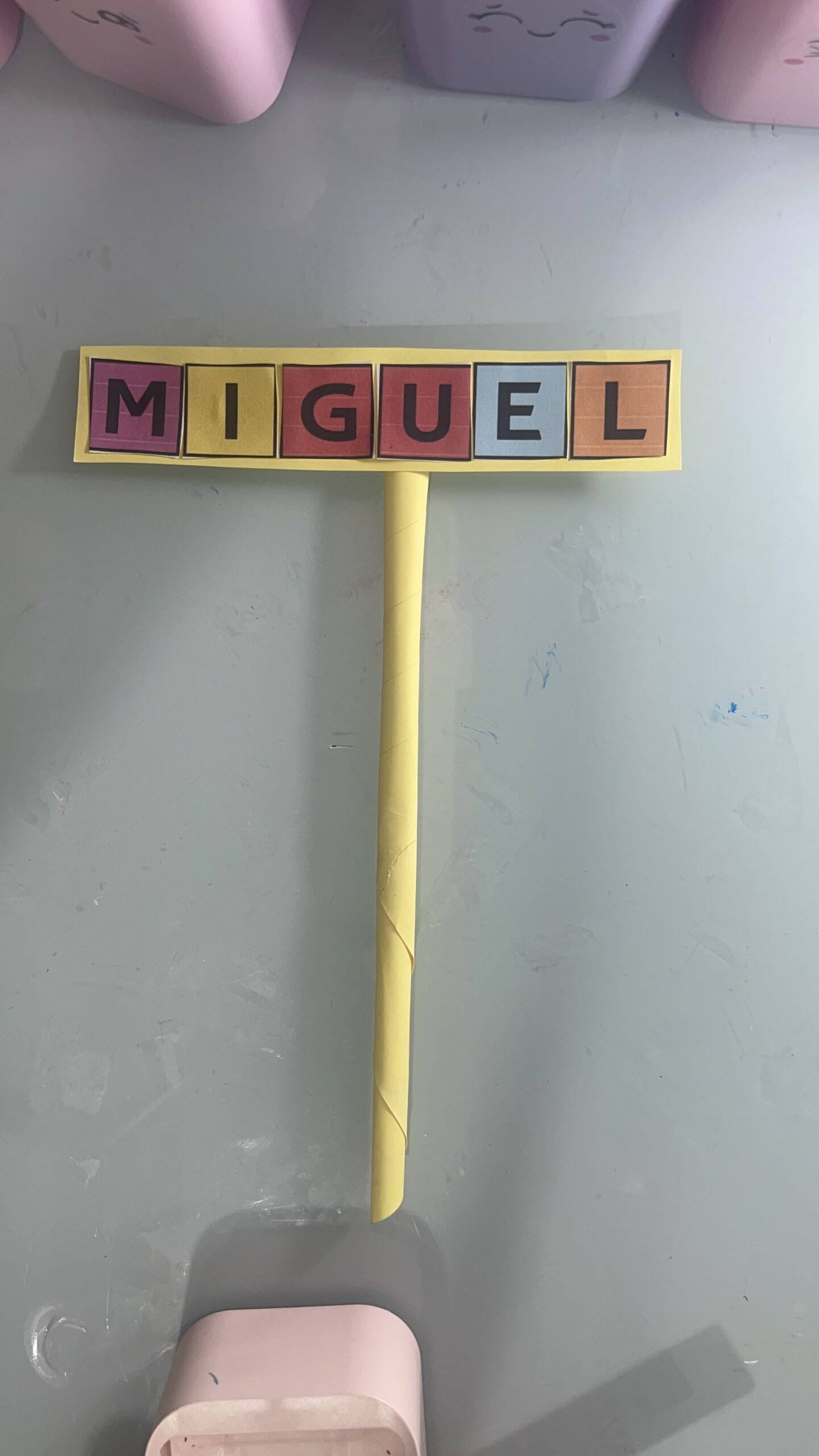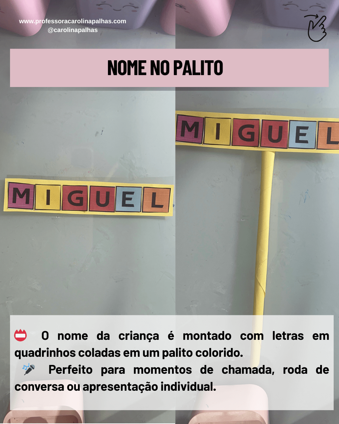 O nome da criança é montado com letras coloridas e colado em um palito colorido ou canudo.