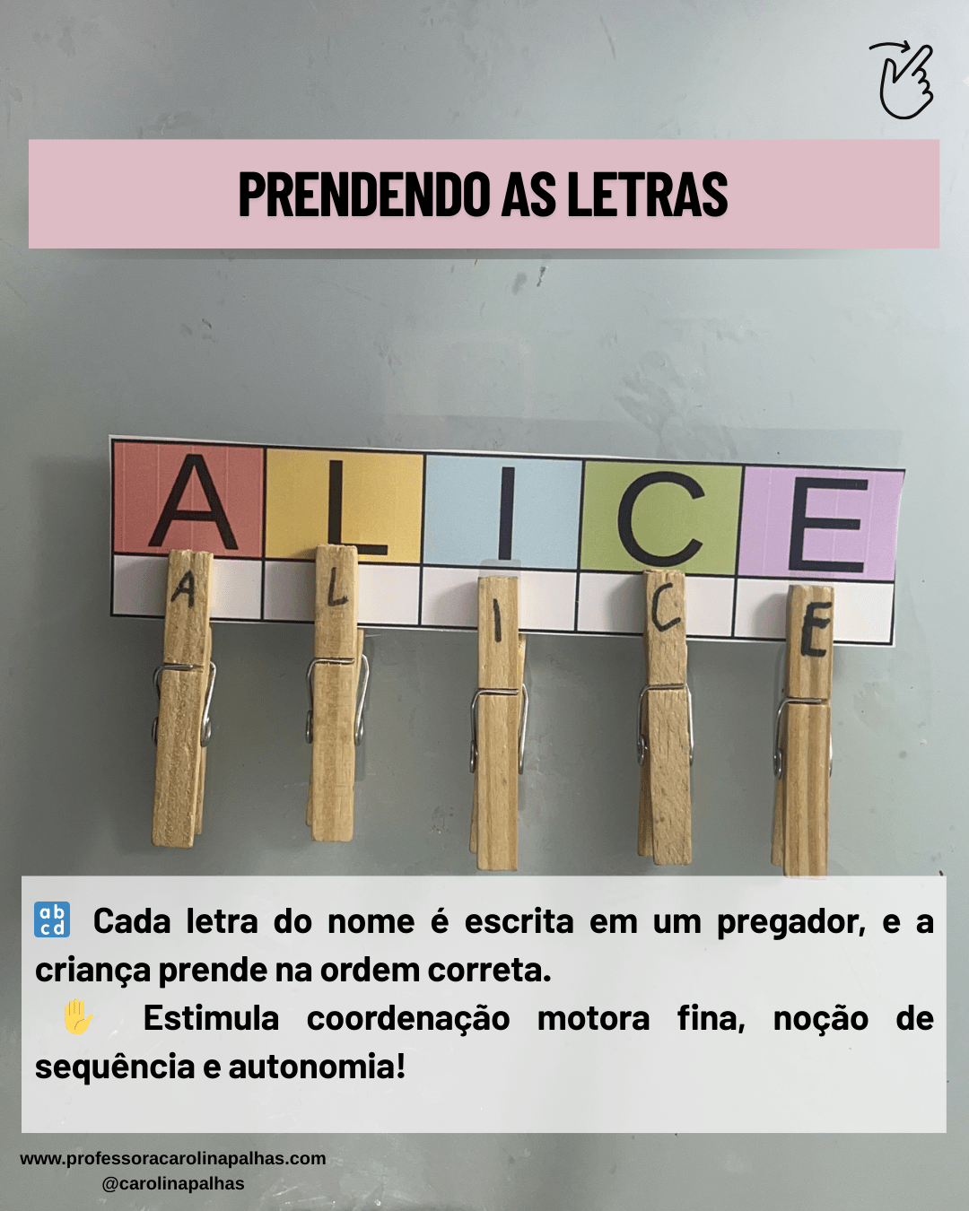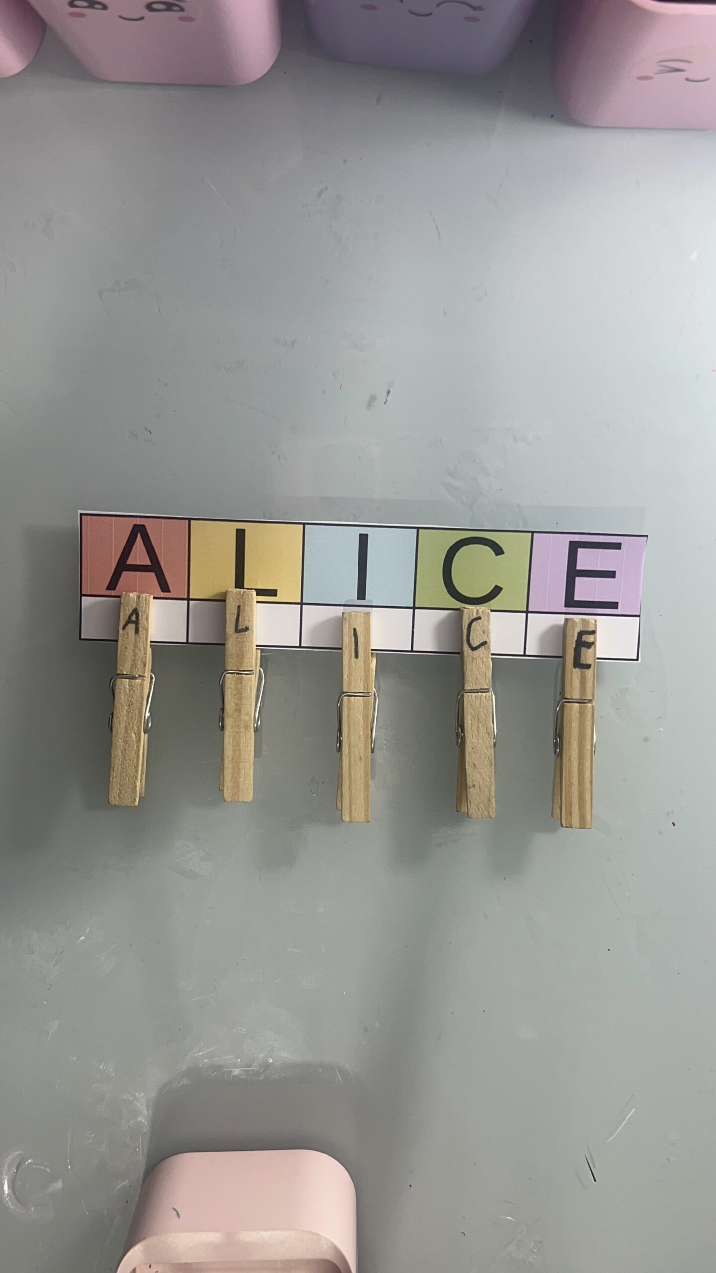 Cada letra do nome da criança é escrita em pregadores, e ela deve prender na ordem correta sobre uma fita, linha ou papel.
