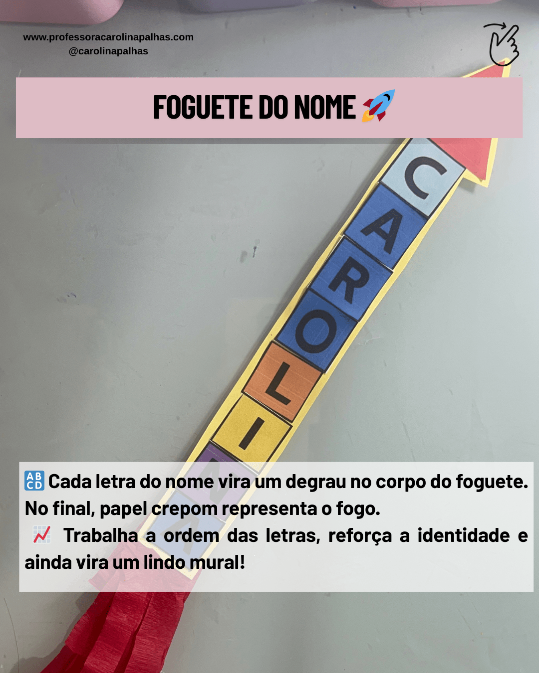 Palavras-chave: nome próprio, identidade, alfabetização, educação infantil, atividades lúdicas, letramento, coordenação motora, BNCC, campos de experiência, consciência fonológica, personagens com letras, pregadores, foguete do nome