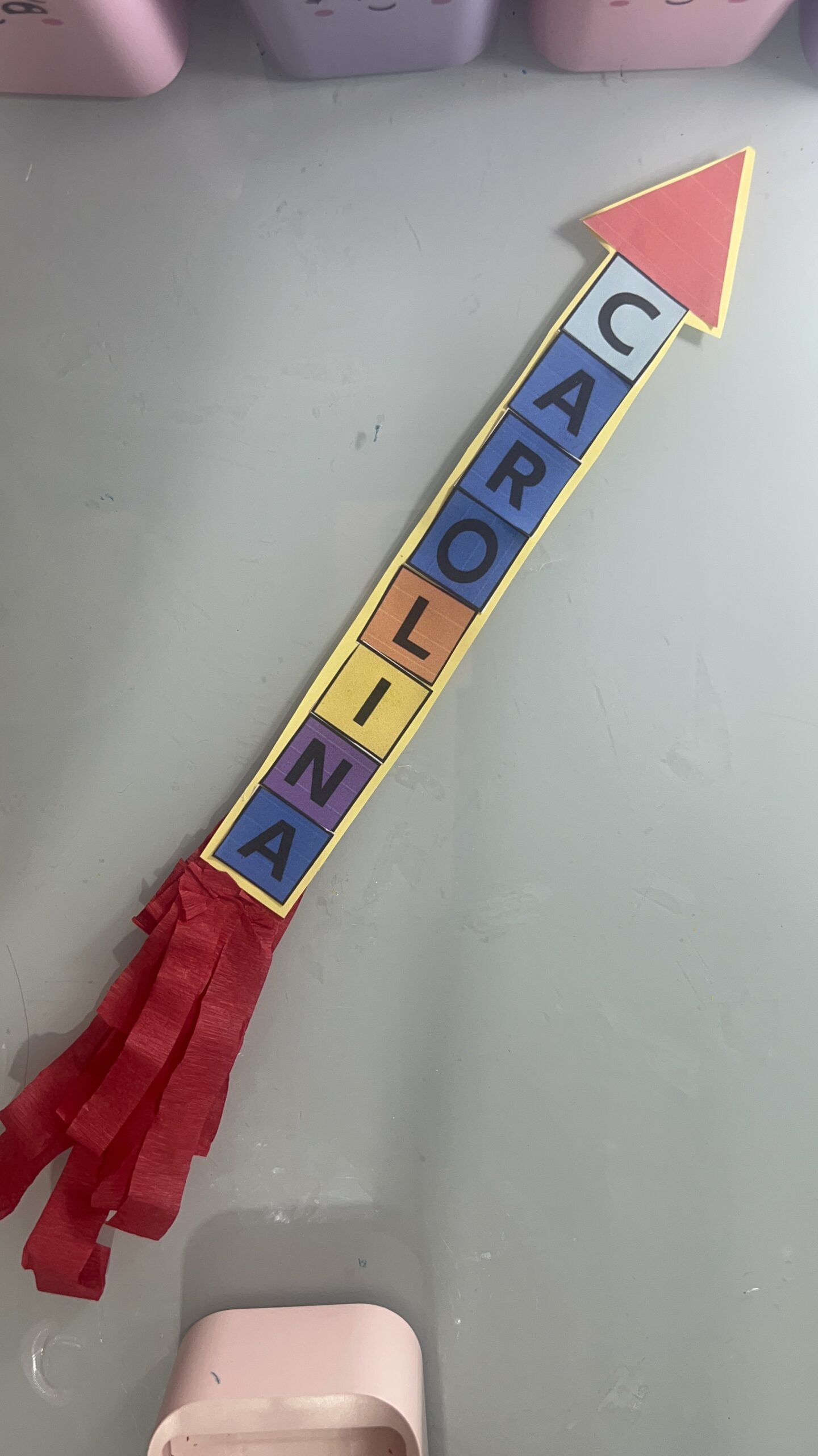 Cada letra do nome forma o corpo do foguete, e o papel crepom vermelho representa o fogo da decolagem!