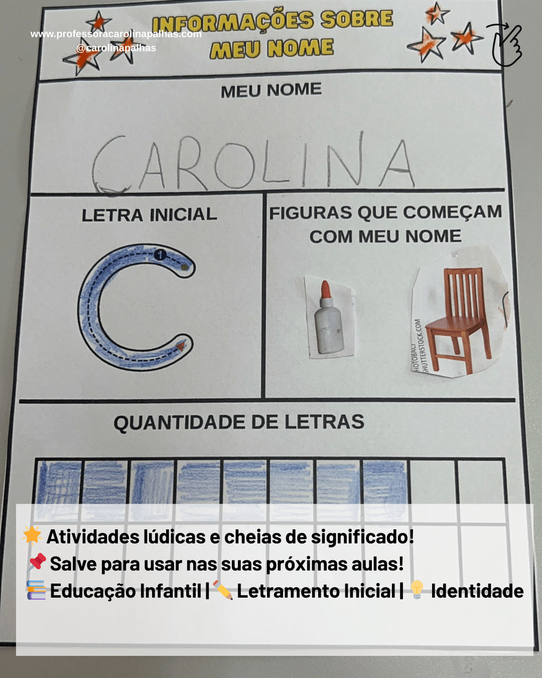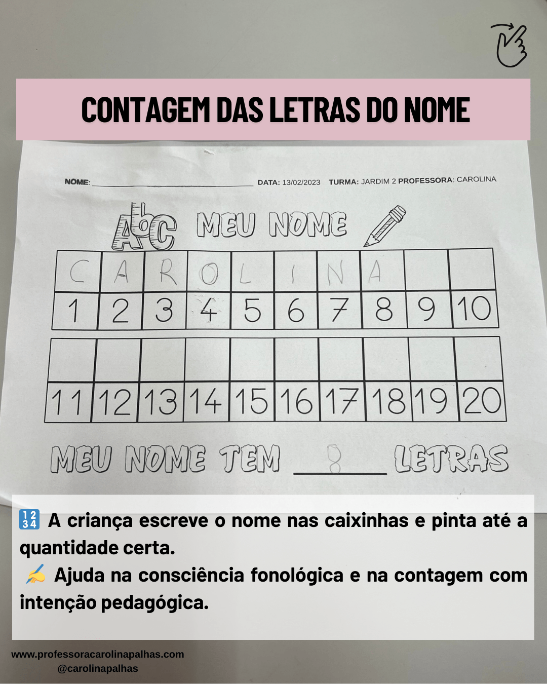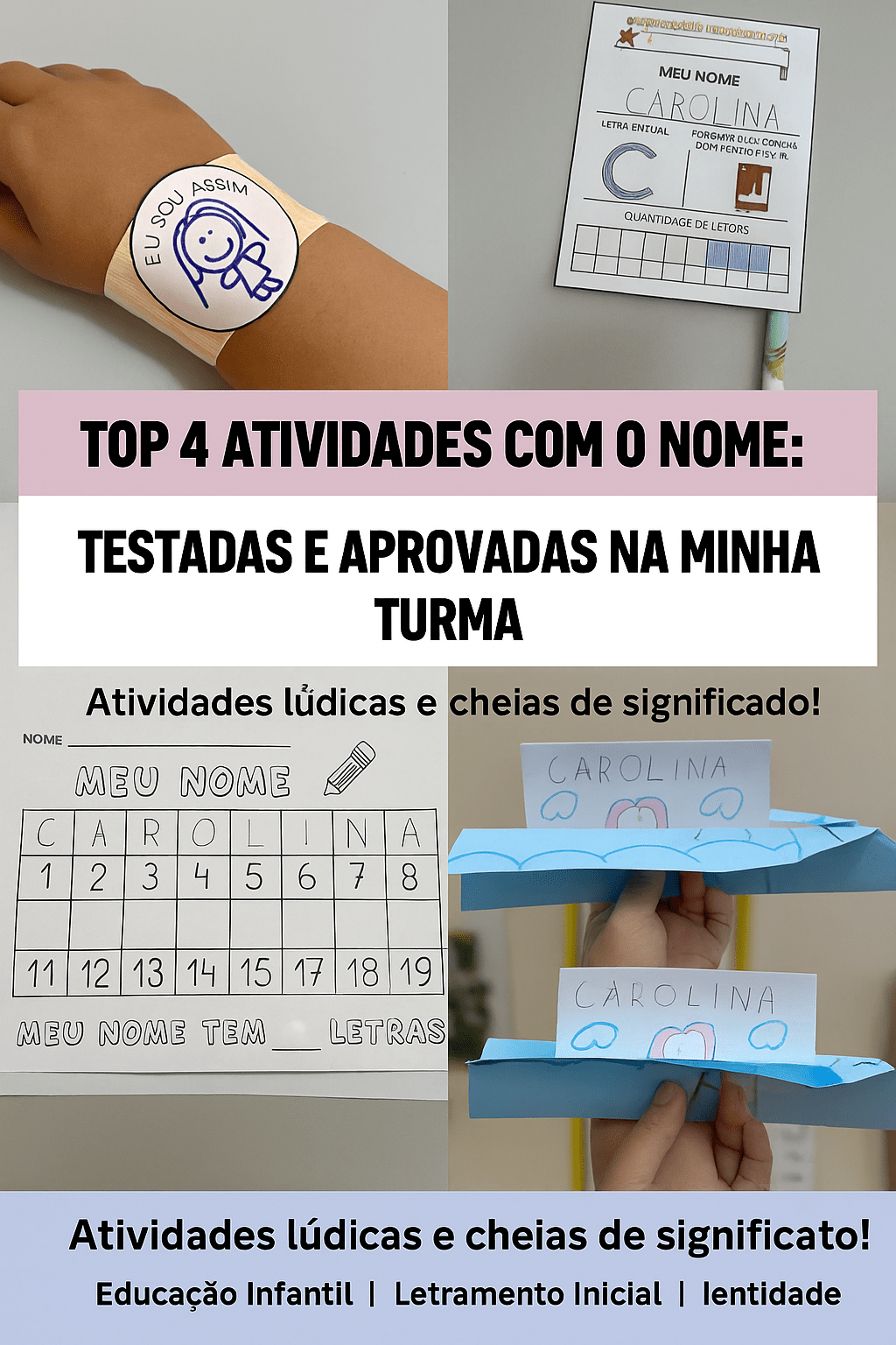 Palavras-chave: atividades com o nome, educação infantil, atividades lúdicas, letramento inicial, identidade, contagem de letras, BNCC, consciência fonológica, atividades pedagógicas, planejamento semanal, nomes próprios, desenvolvimento infantil
