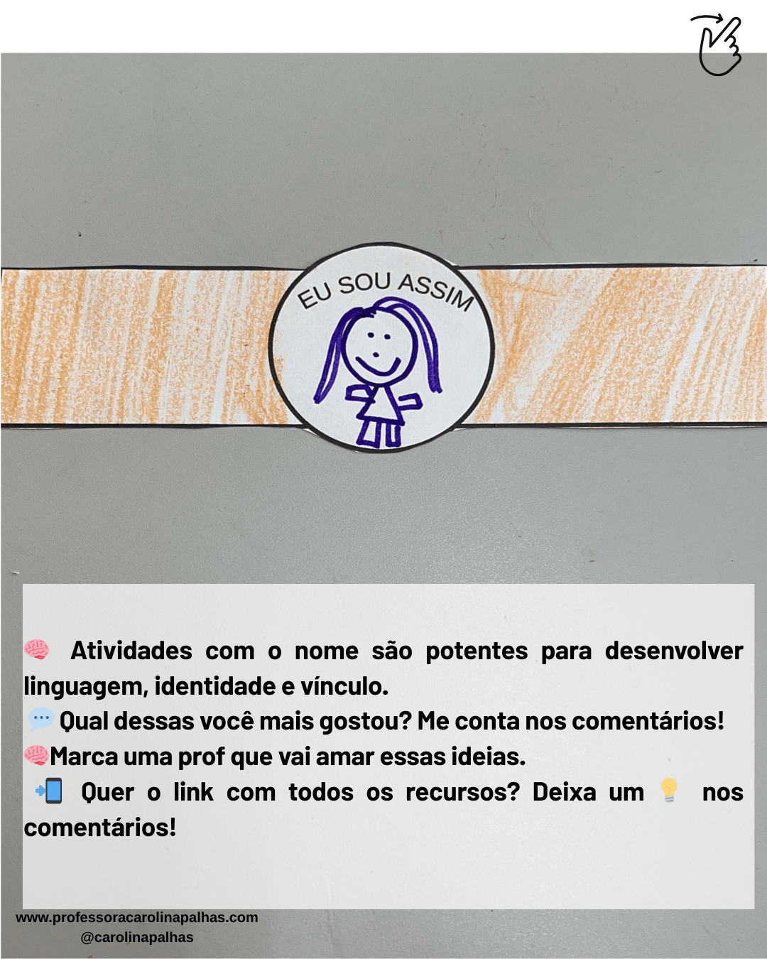 🎨 A criança desenha seu autorretrato e monta uma pulseira com o texto “EU SOU ASSIM”. Depois, ela usa no braço, mostrando com orgulho a própria identidade.