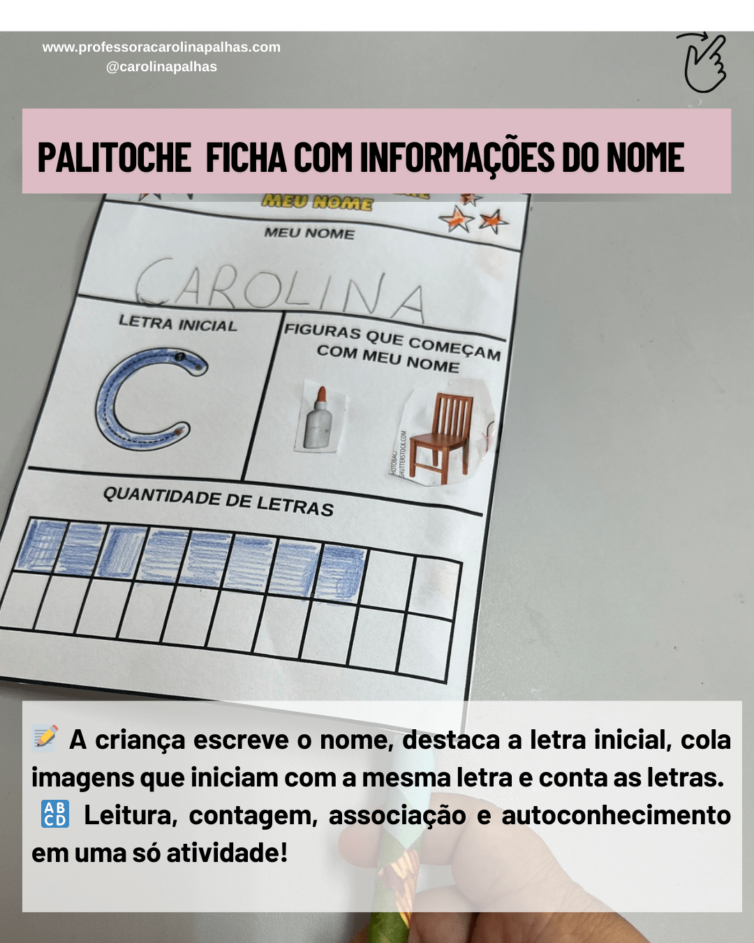 Quando a criança vê seu nome nas atividades, ela se sente pertencente. Isso gera engajamento, autoestima e entusiasmo. Além disso, o nome é um ótimo ponto de partida para desenvolver a linguagem oral e escrita, as habilidades matemáticas, a coordenação motora e a consciência fonológica.