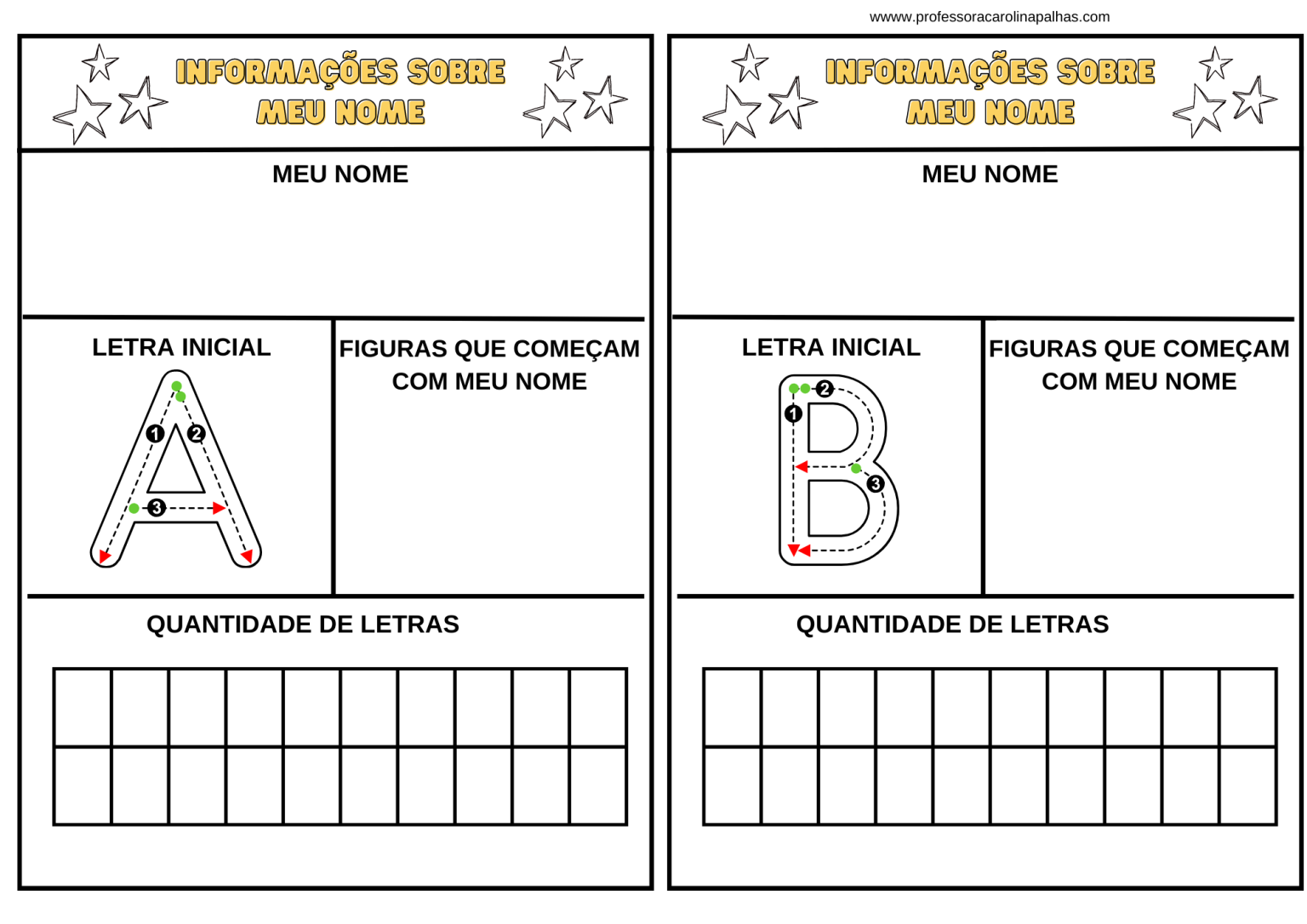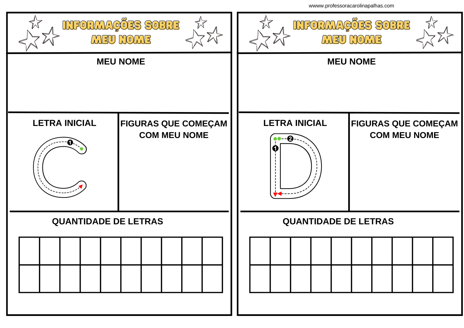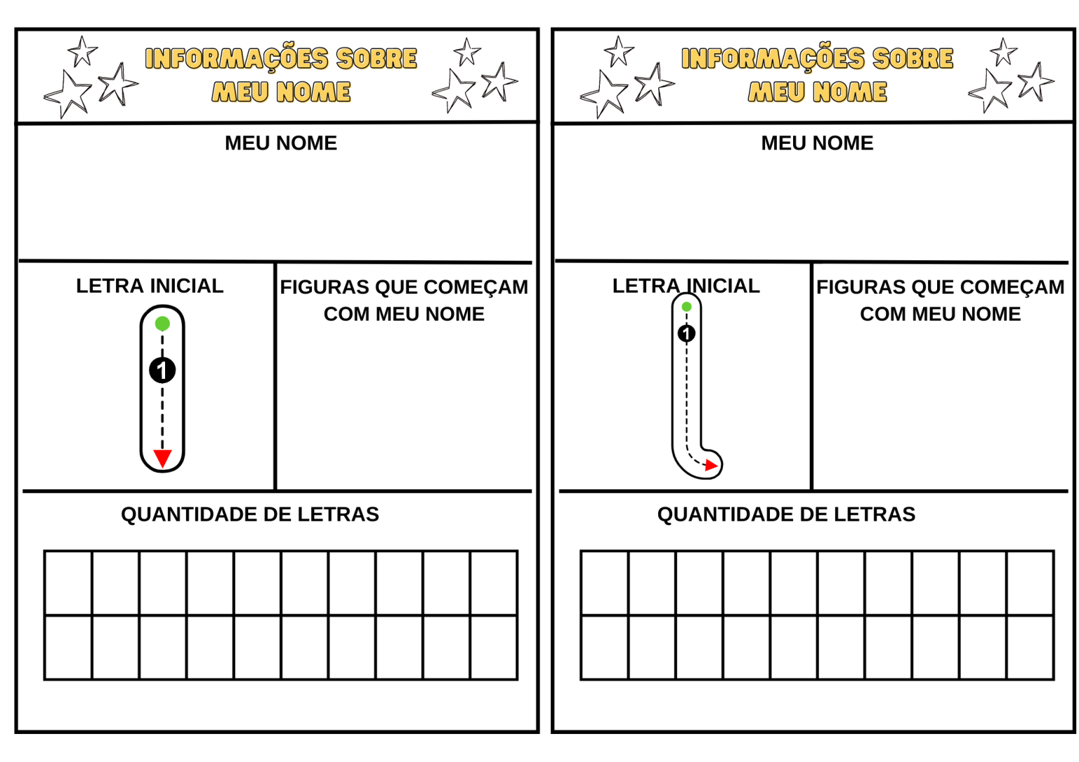 📝 A criança escreve seu nome, identifica a letra inicial, cola imagens que começam com a mesma letra e conta a quantidade de letras.