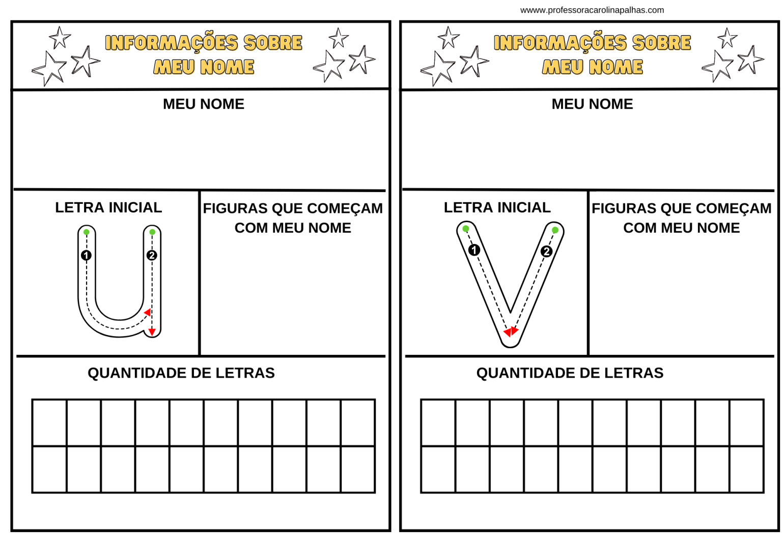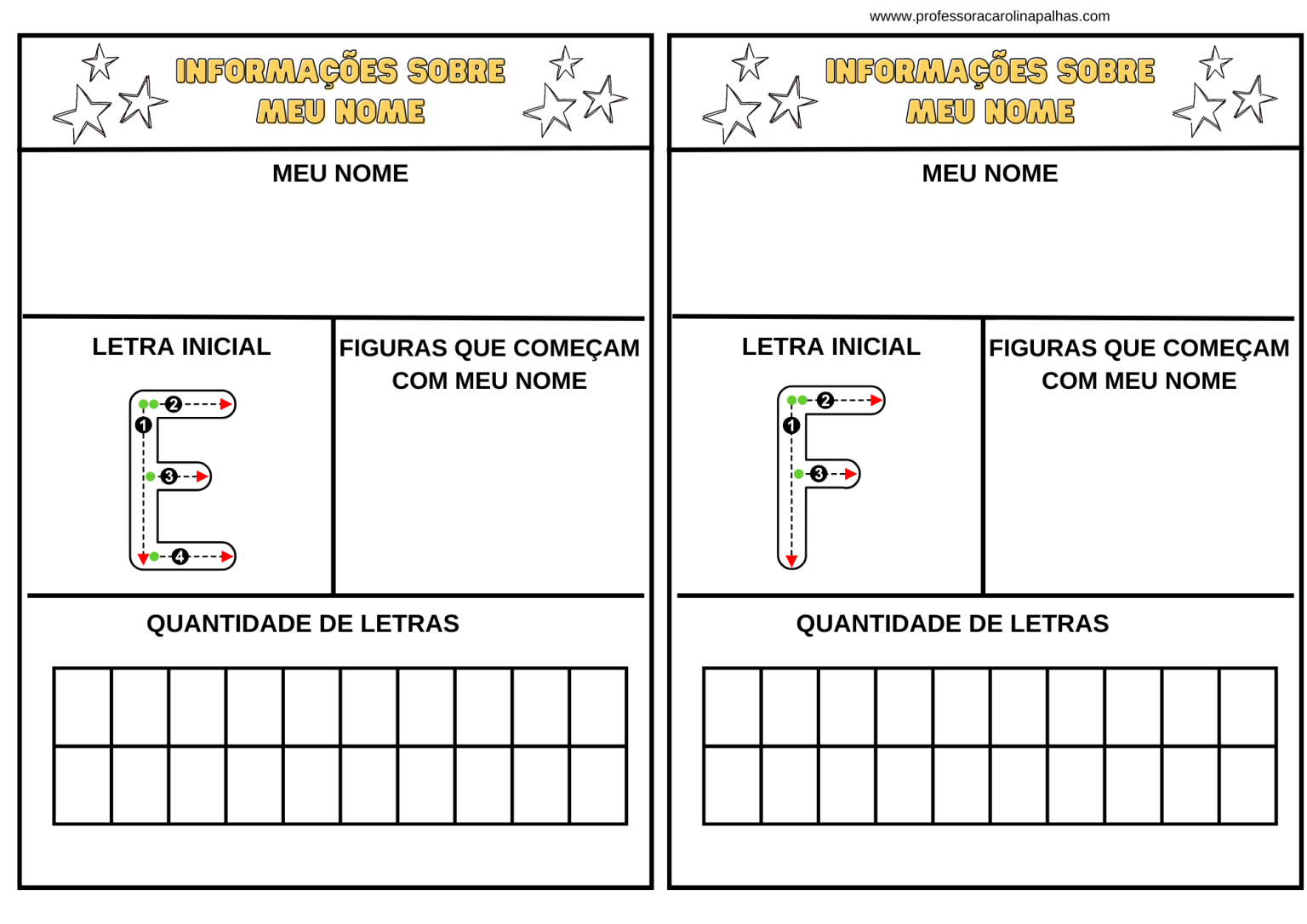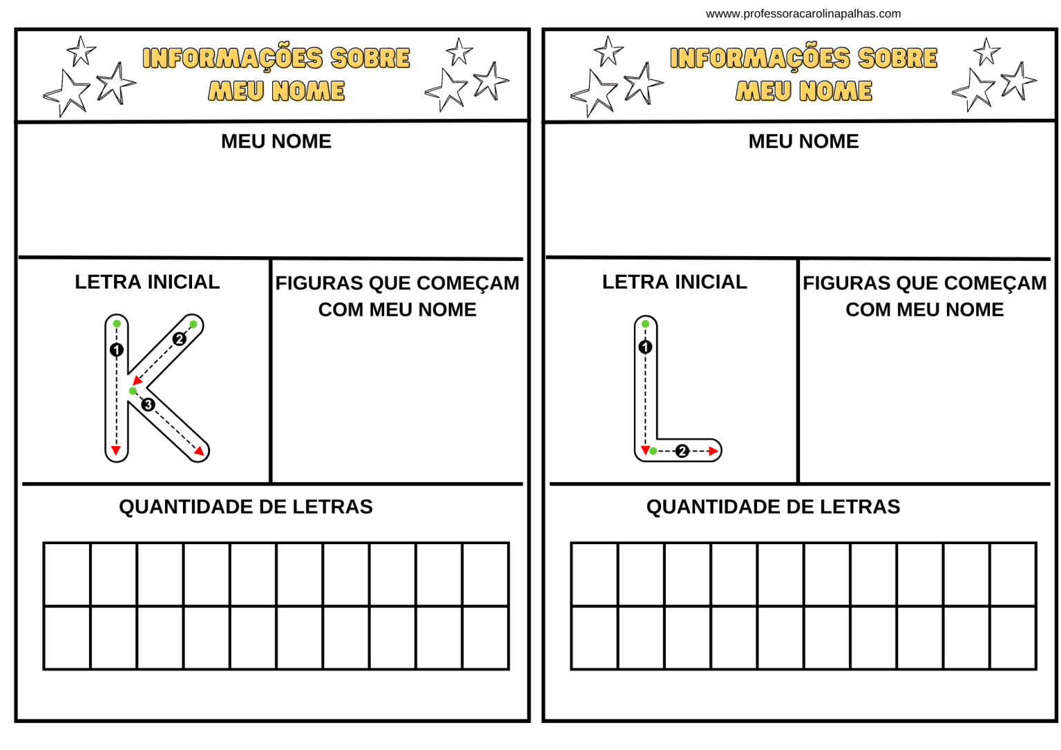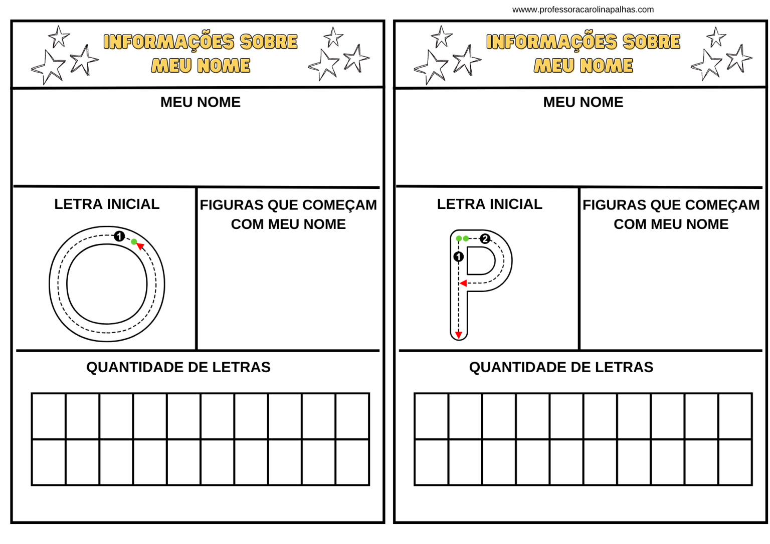 📝 A criança escreve seu nome, identifica a letra inicial, cola imagens que começam com a mesma letra e conta a quantidade de letras.