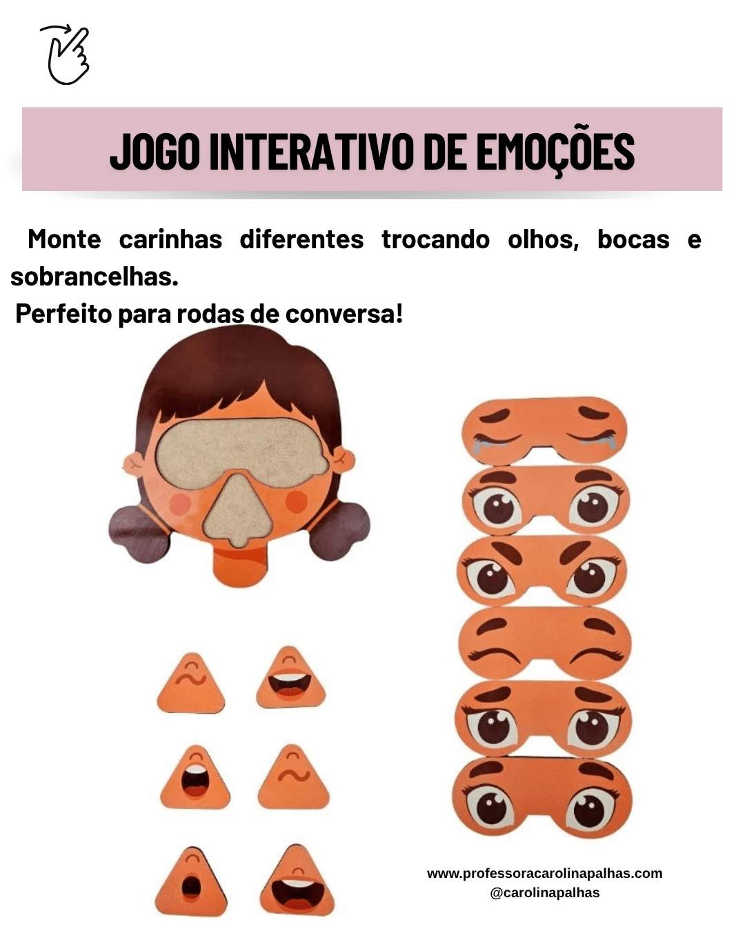 Com versão feminina e masculina, as crianças podem montar expressões faciais diferentes usando olhos, bocas e sobrancelhas. Um recurso excelente para rodas de conversa!