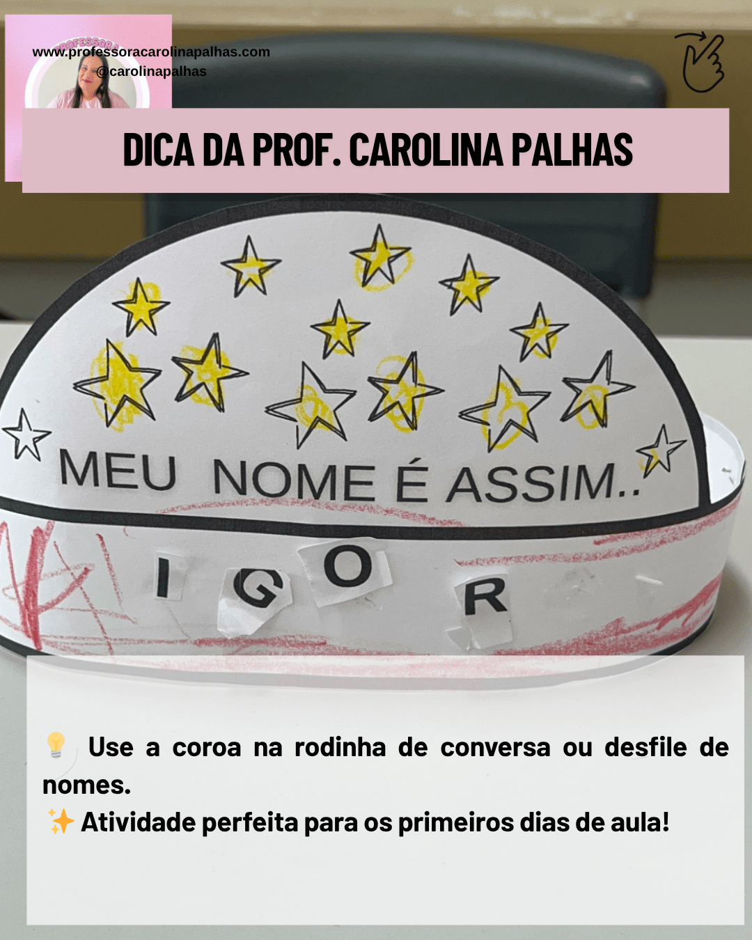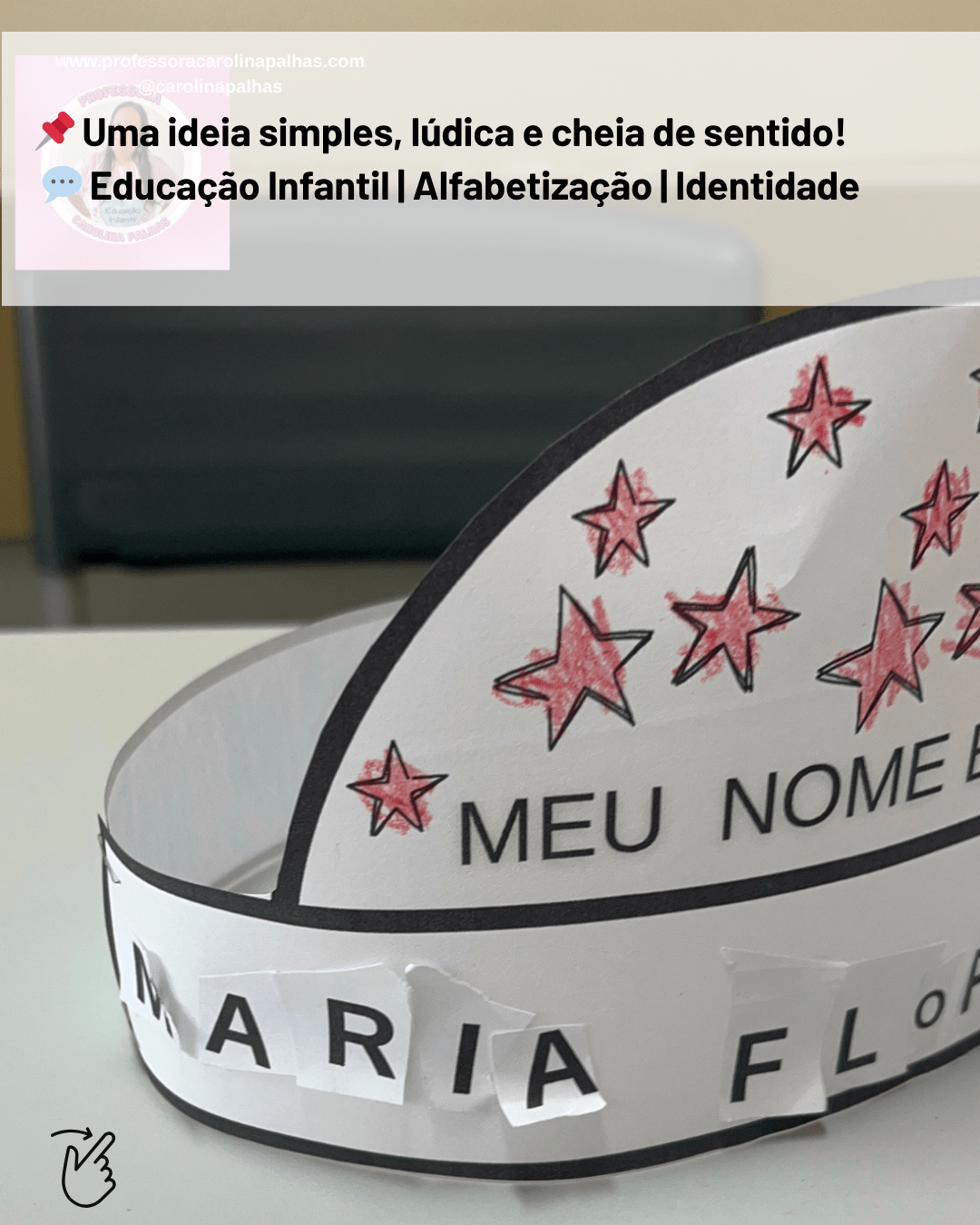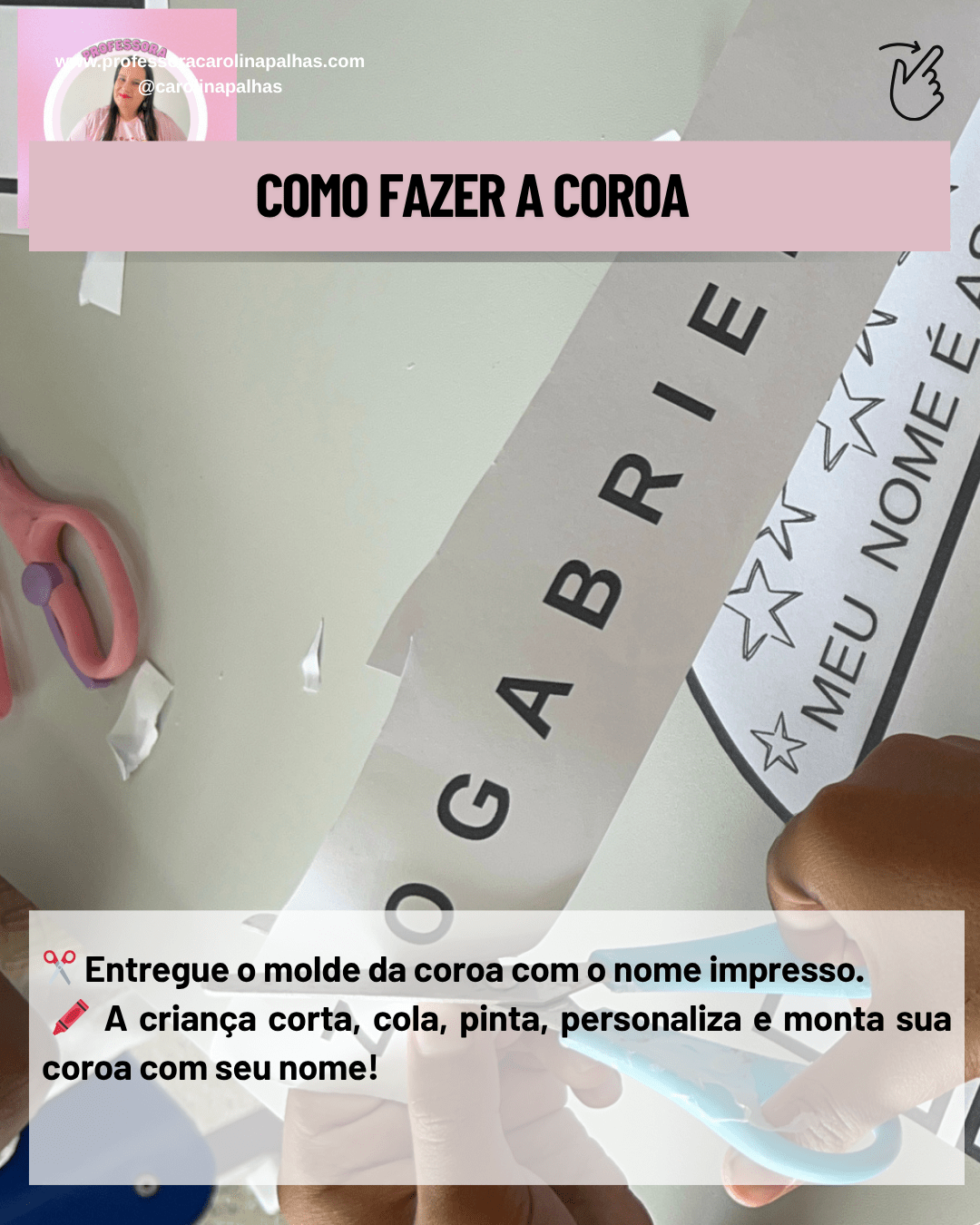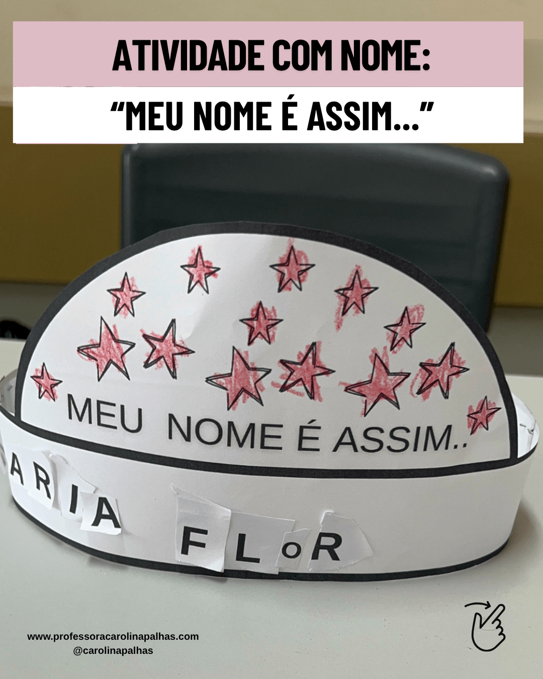 Cada criança recebe uma coroa com a frase “MEU NOME É ASSIM…” e letras do seu nome recortadas. Elas devem organizar as letras, colar na base da coroa, colorir e personalizar com desenhos. A coroa pode ser usada no momento da rodinha ou desfile dos nomes, promovendo interação e orgulho pela identidade.