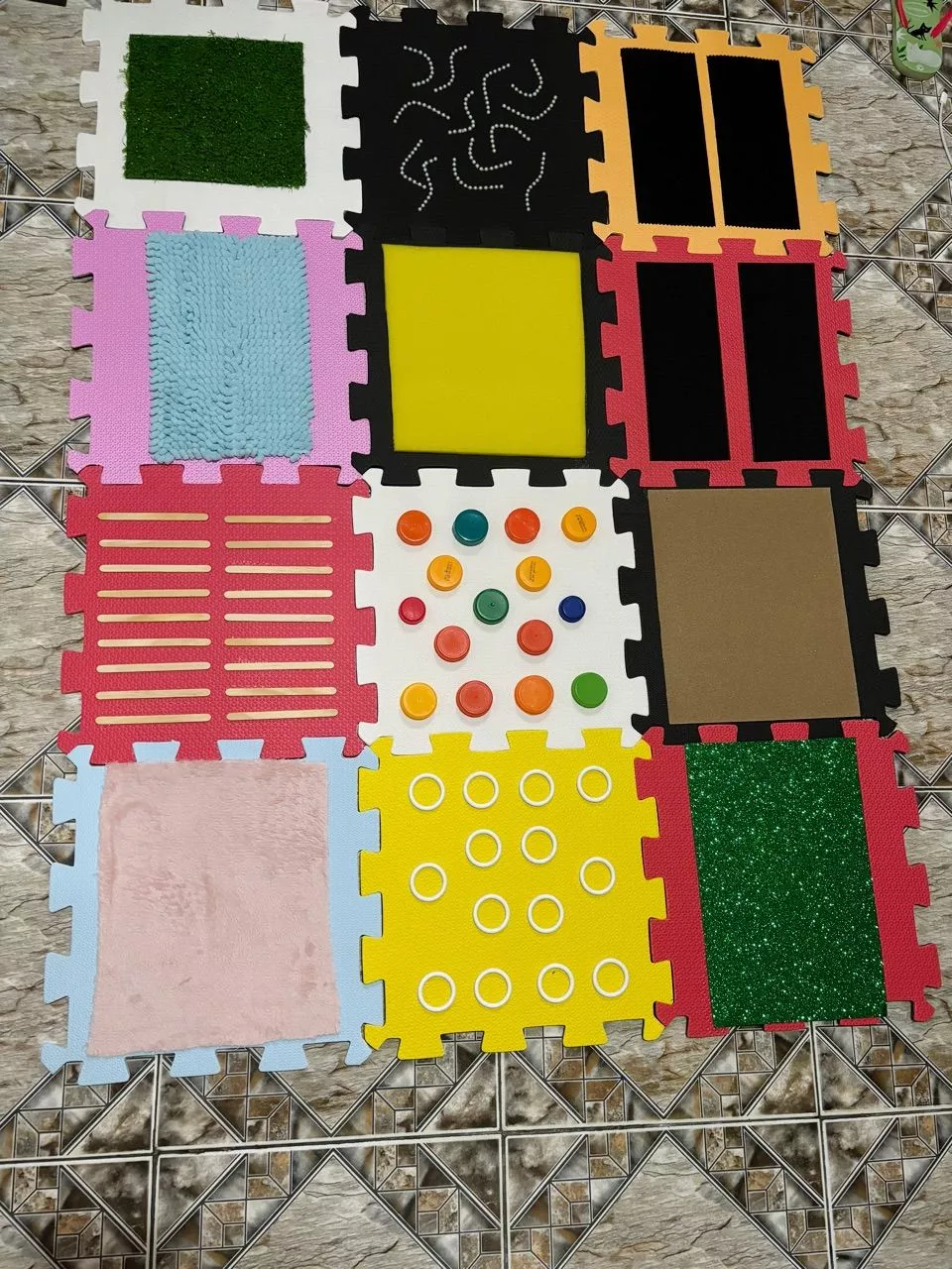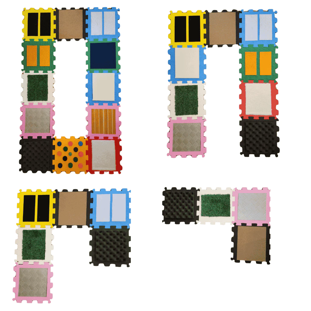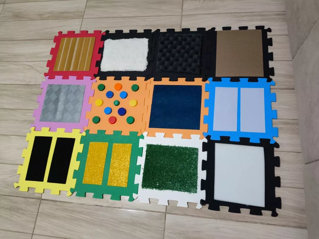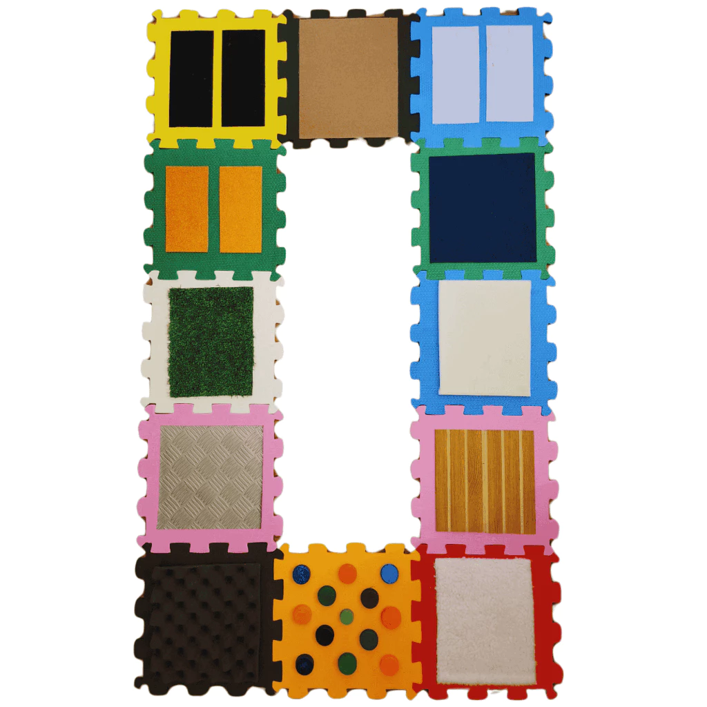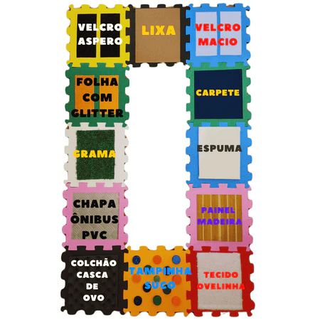 Esse modelo é composto por de 6 a 12 placas de EVA com texturas diversas: grama, lixa, feltro, espuma, glitter, tampinhas, corda, tecido atoalhado e muito mais. Cada plaquinha é um convite ao toque e à curiosidade.