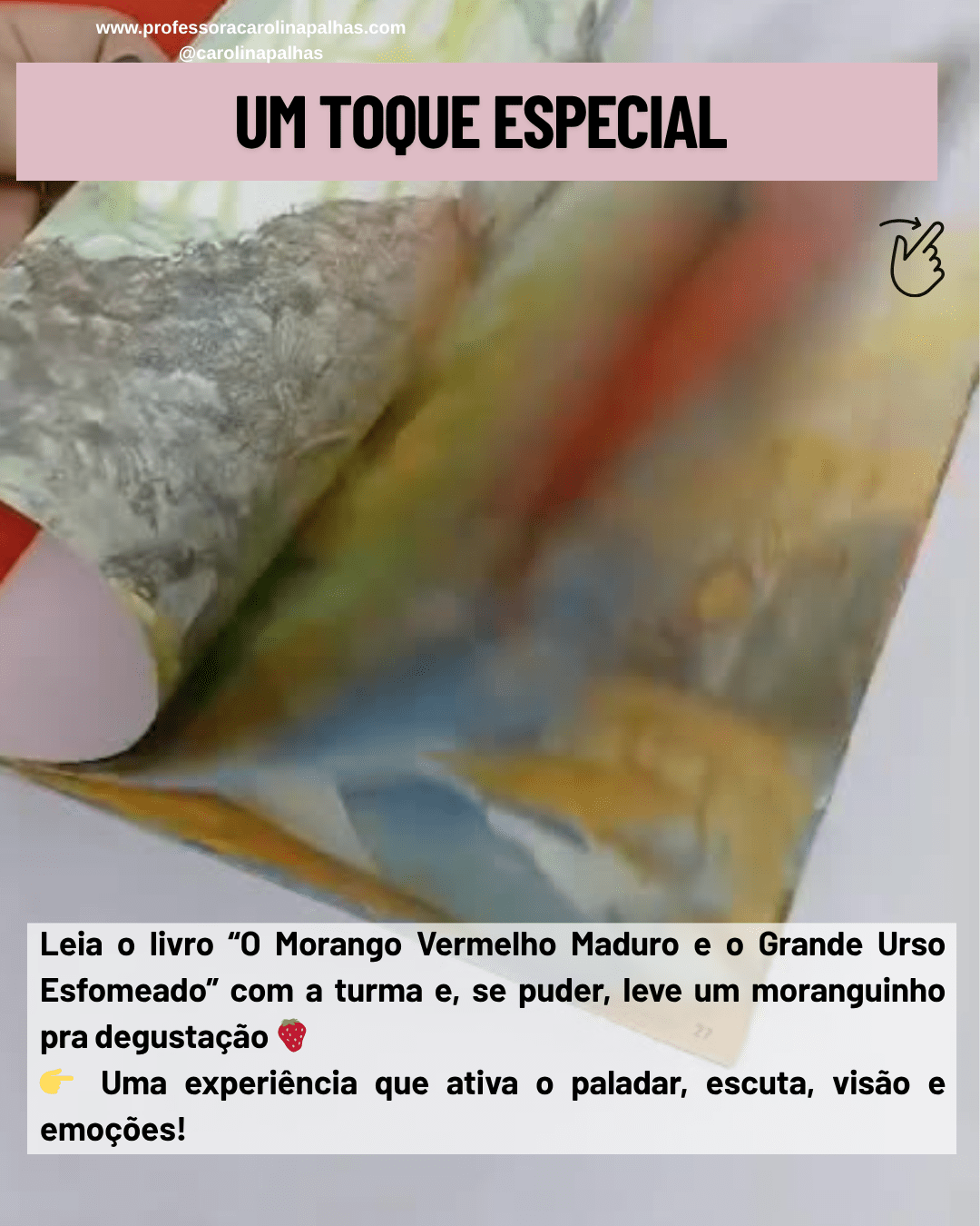 Se puder, leve morangos de verdade para as crianças experimentarem. Essa vivência sensorial conecta o conteúdo à realidade e marca positivamente a experiência com a fruta.