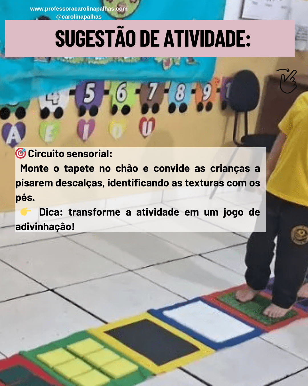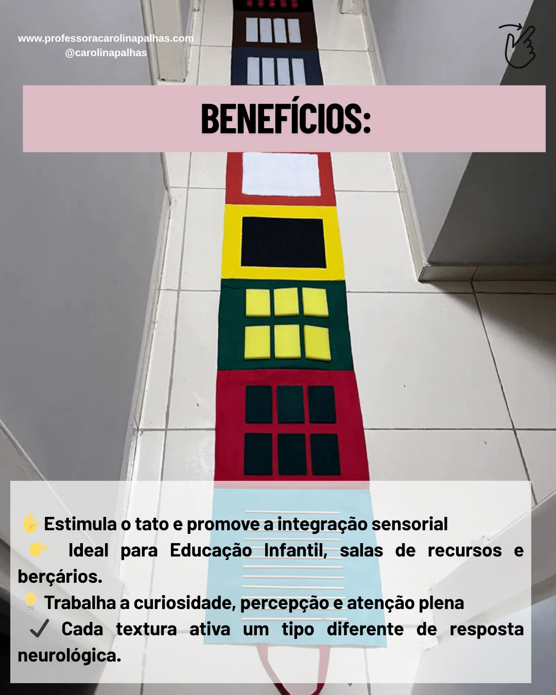 “Esse tapete sensorial é aquele tipo de recurso que eu AMO indicar, porque dá resultado de verdade! As crianças exploram, se divertem e aprendem enquanto caminham. É perfeito para incluir na rotina da sala de aula, especialmente em momentos de circuito motor, atividades sensoriais ou acolhimento!”