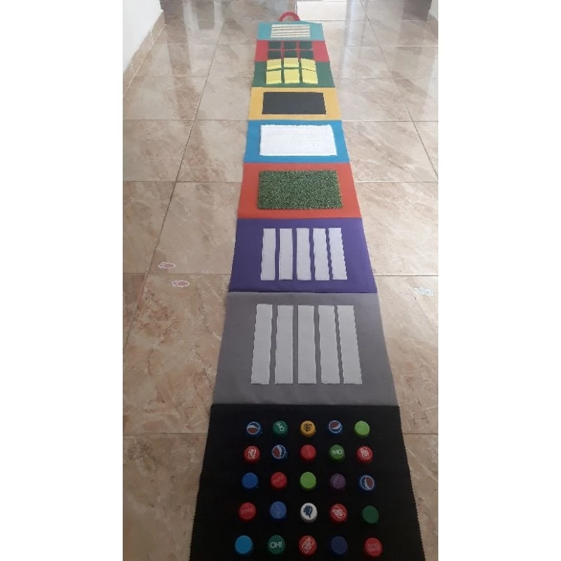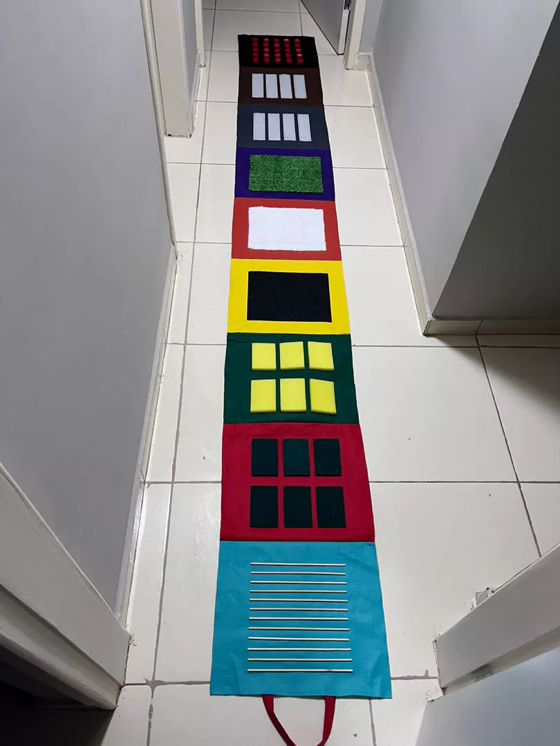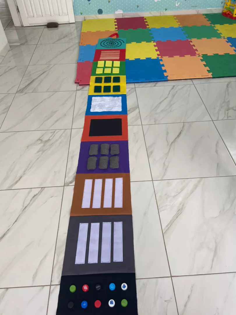 O tapete sensorial com texturas é um recurso pedagógico que combina ludicidade, estimulação tátil e inclusão. Ele é composto por retângulos de 30x35cm com diferentes materiais, cada um oferecendo uma experiência sensorial única. Esses retângulos podem ser organizados em sequências de 5, 7 ou 9 peças, e vêm unidos por uma base resistente, fácil de enrolar e transportar graças à alça integrada.