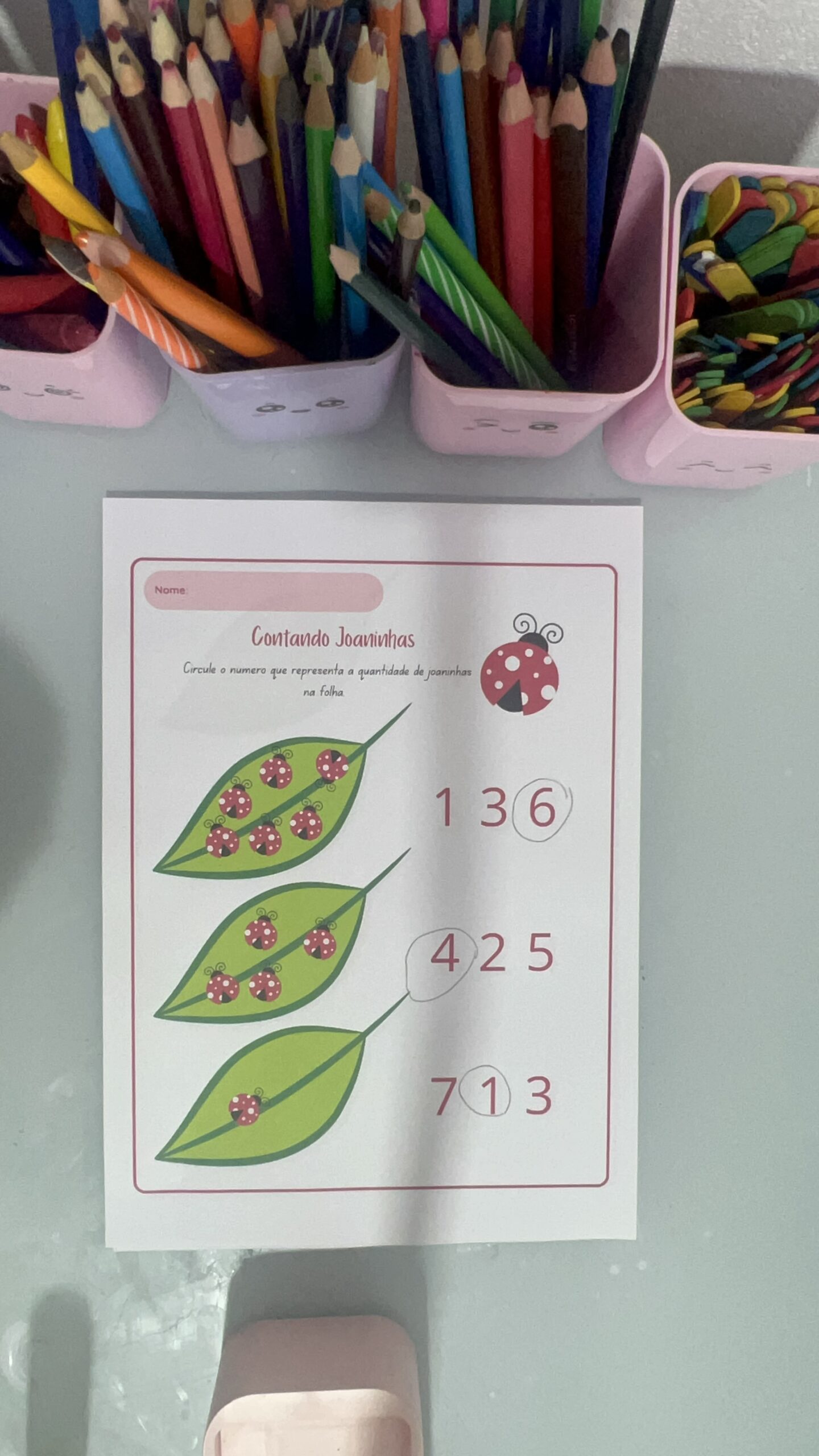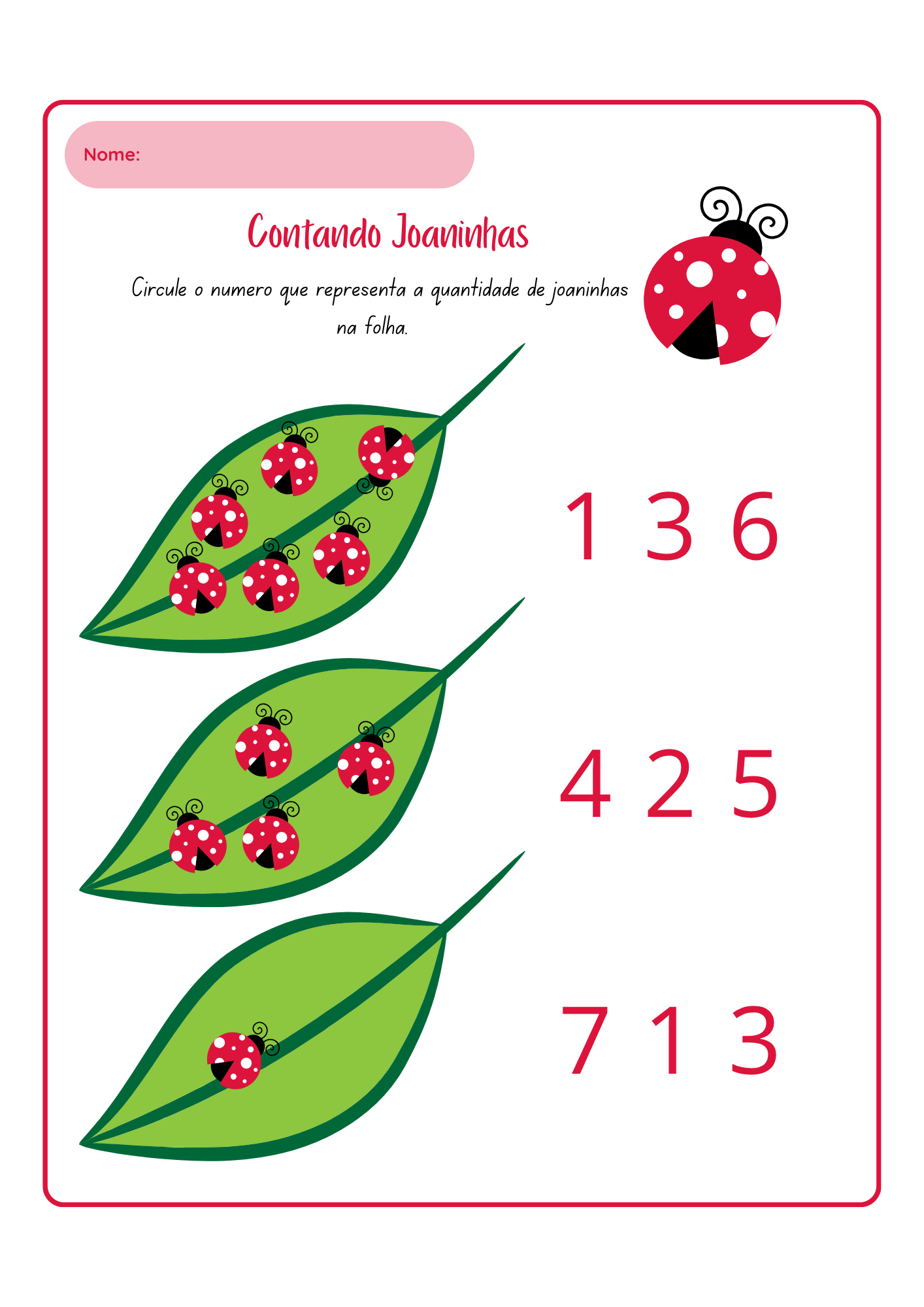 Palavras-chave: atividade joaninha, contagem joaninha, atividade com folhas e joaninhas, contagem divertida, atividade de matemática, números para educação infantil, atividade lúdica com números, atividade para imprimir, BNCC matemática, contagem até 10, atividade para crianças, matemática infantil, coordenação motora fina, quantificação, jogos de contar, atividades para educação infantil.