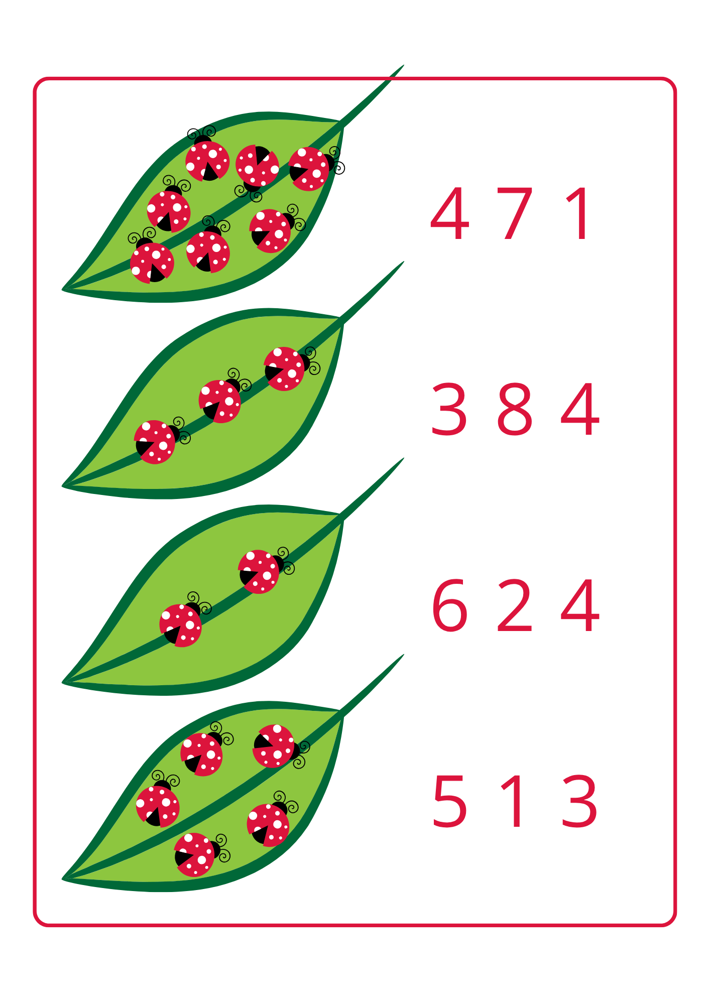 2. Peça que a criança conte com os dedinhos quantas joaninhas há em cada folha.