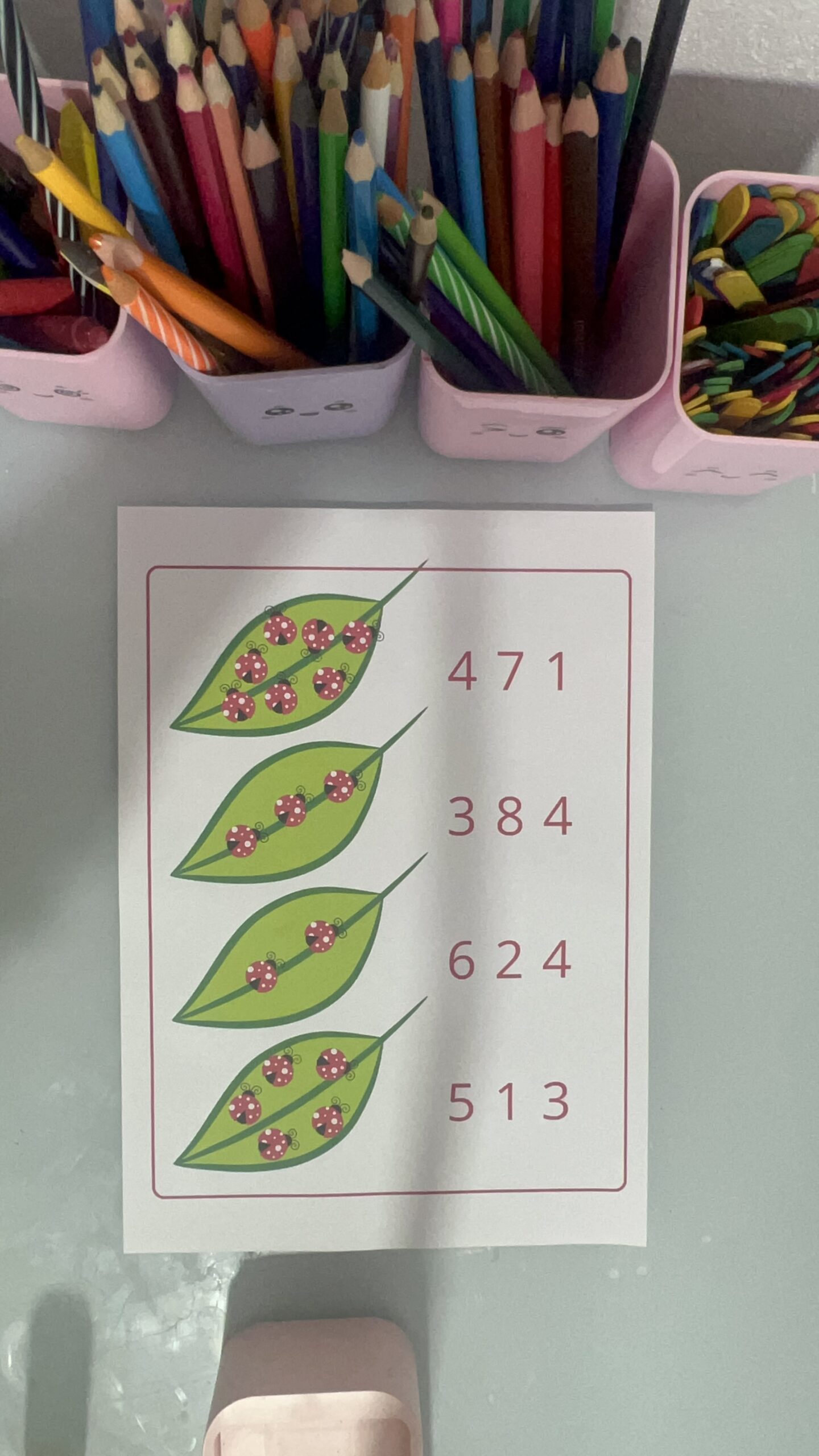 • Ficha impressa com folhas verdes e joaninhas desenhadas (quantidade variada em cada folha);