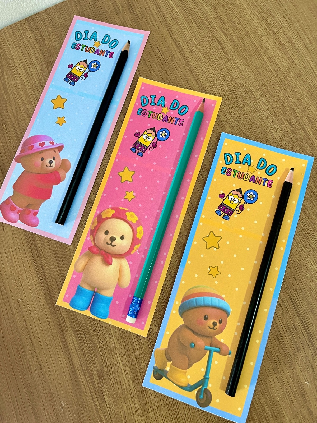 - Cartões com lápis (lembrancinha): Kit com suporte para lápis de cor ou preto, ideal para entregar como mimo.