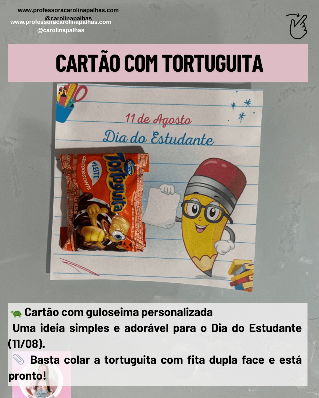 Uma alternativa criativa e que as crianças amam. A Tottuguita pode ser fixada em um cartão escolar divertido com desenho de lápis e caderno.