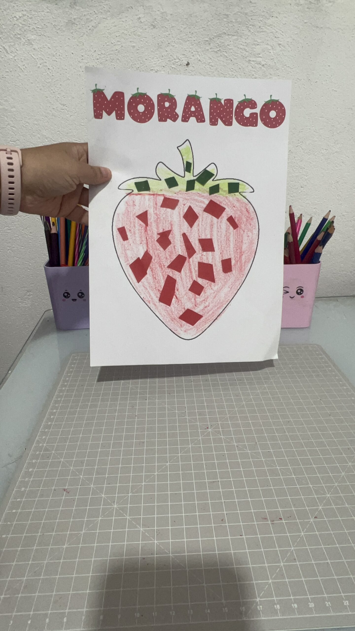 - Finalização com Título: Adicionei o título “MORANGO” com letras coloridas e decoradas, e deixei que cada criança identificasse a letra inicial do seu nome (atividade integrada de linguagem).