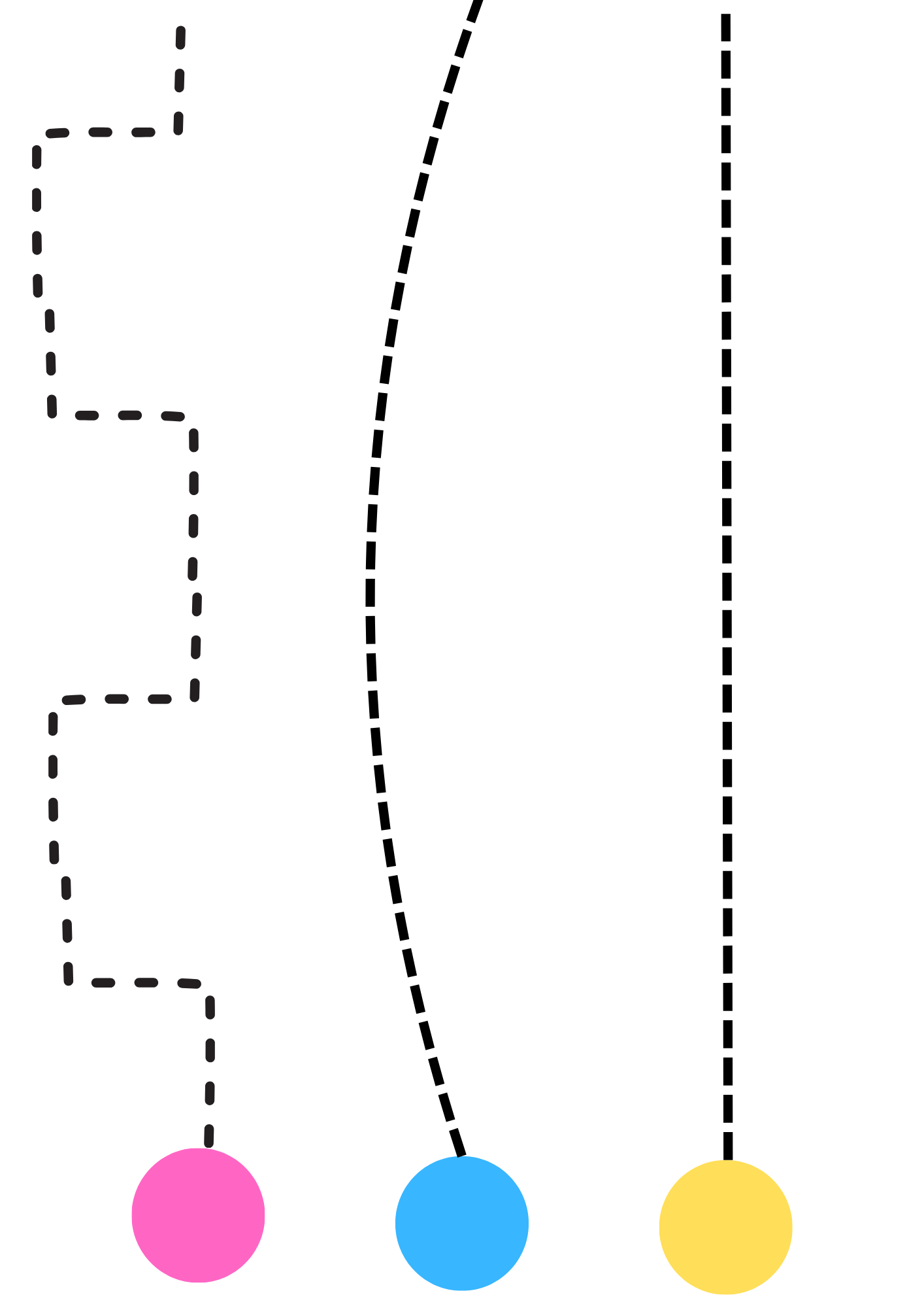 Bolinhas coloridas no início dos trajetos (rosa, azul, amarelo).