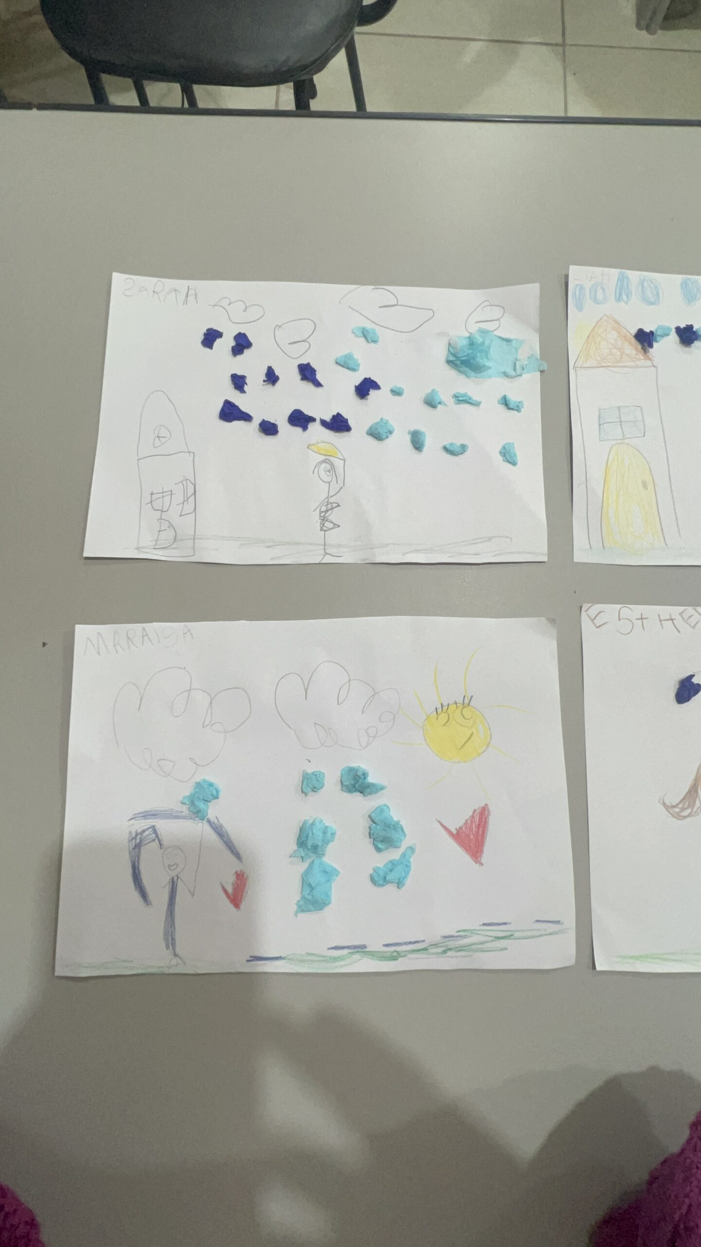 Cada criança recebeu uma folha para desenhar uma cena de chuva com elementos como sol, nuvens e paisagem. -