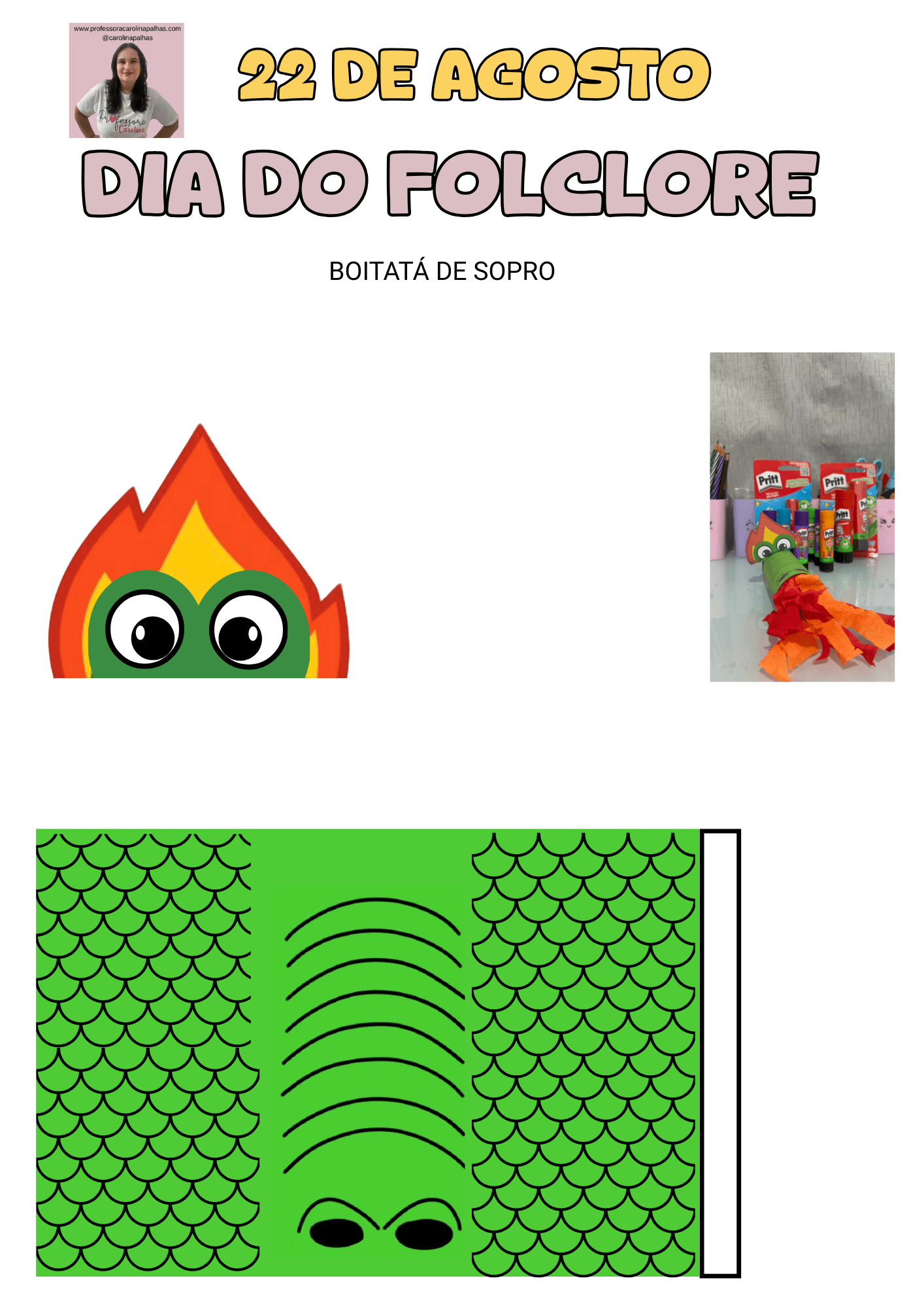 Palavras-chave: boitatá de sopro, atividades criativas, folclore brasileiro, educação infantil, atividades pedagógicas, atividades folclore, releitura do boitatá, artes infantis, atividades com papel, atividades para professores, molde boitatá, atividades para crianças, brincadeiras folclore