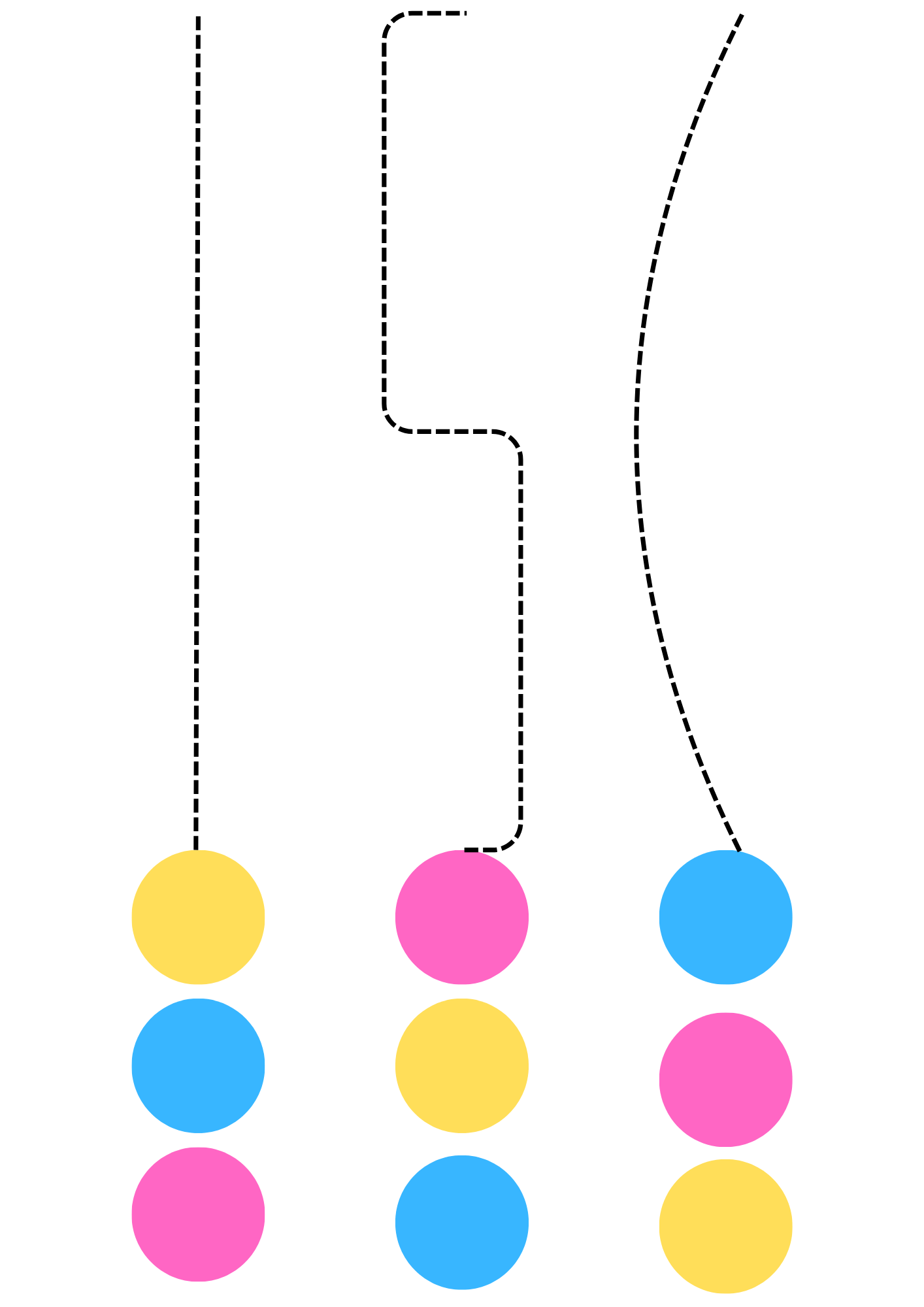 • Bolinhas coloridas no início dos trajetos (rosa, azul, amarelo).