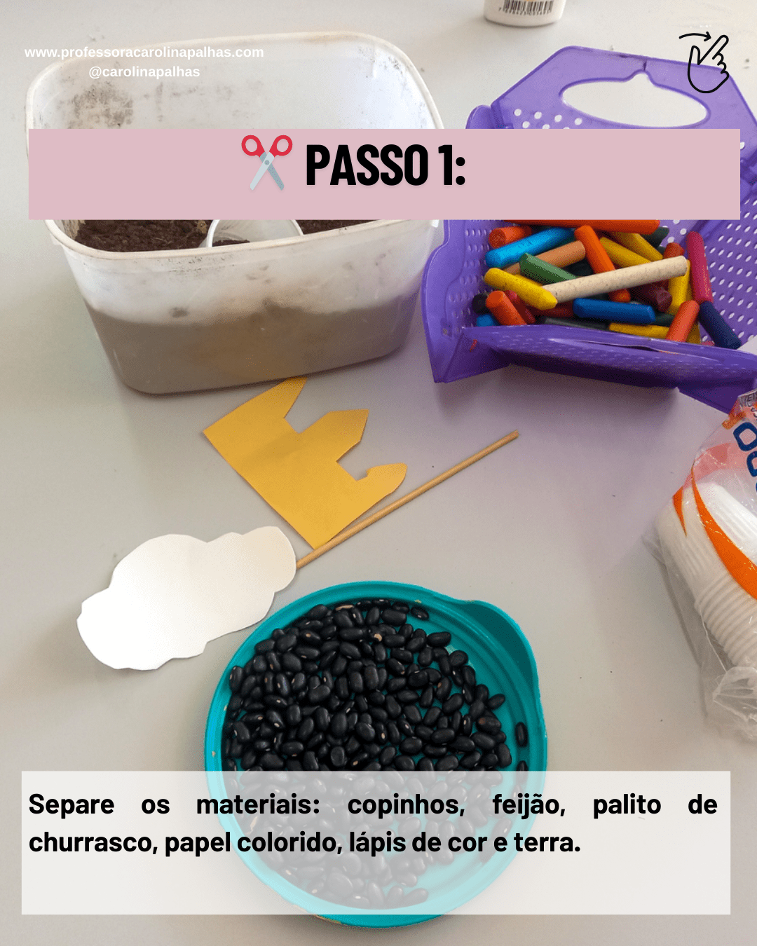 Materiais necessários: copinhos, feijão, terra, palito de churrasco, papel colorido, lápis de cor, cola.