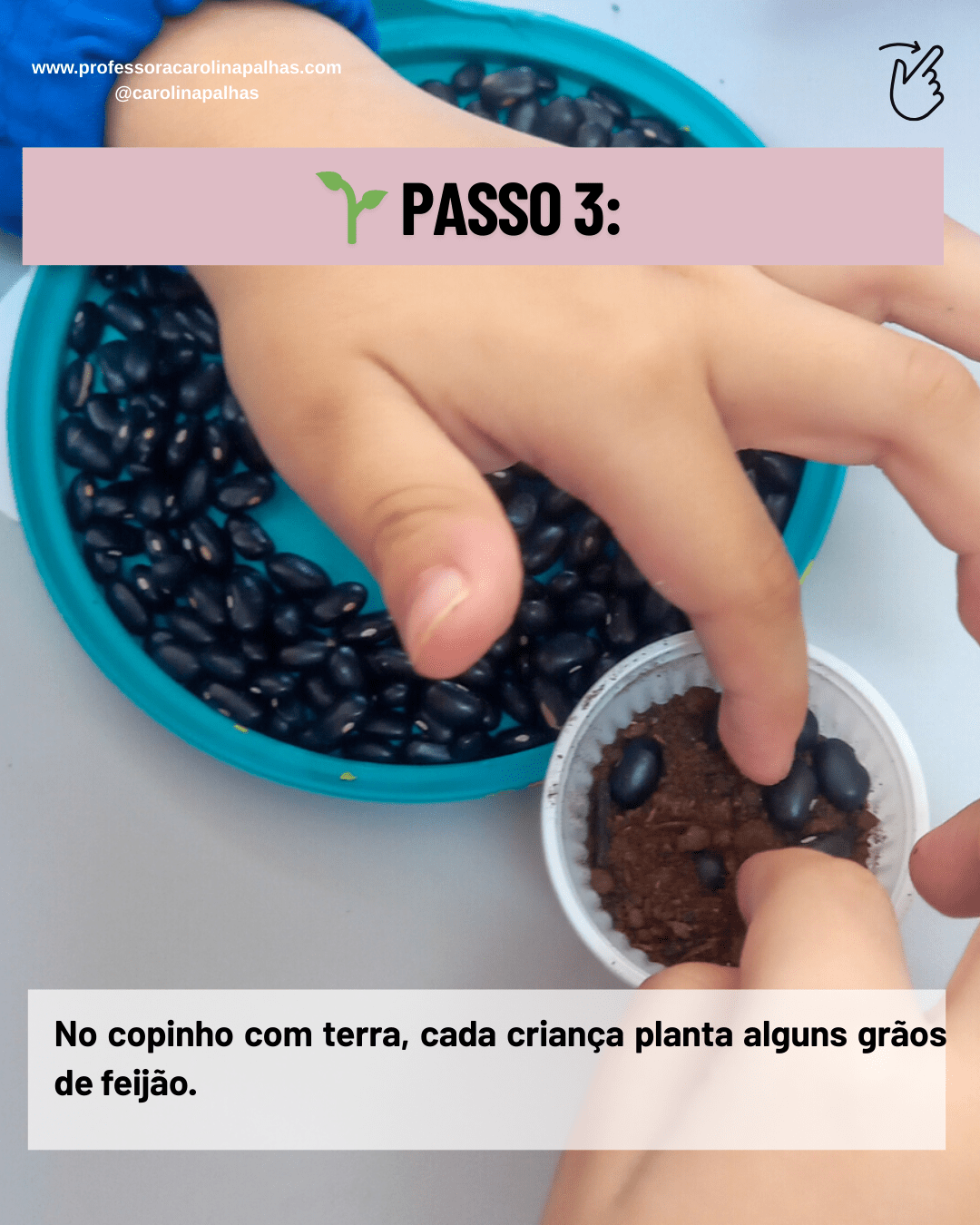 3️⃣ Plante o feijão – O copinho com terra recebe os grãos, que serão cuidados diariamente.
