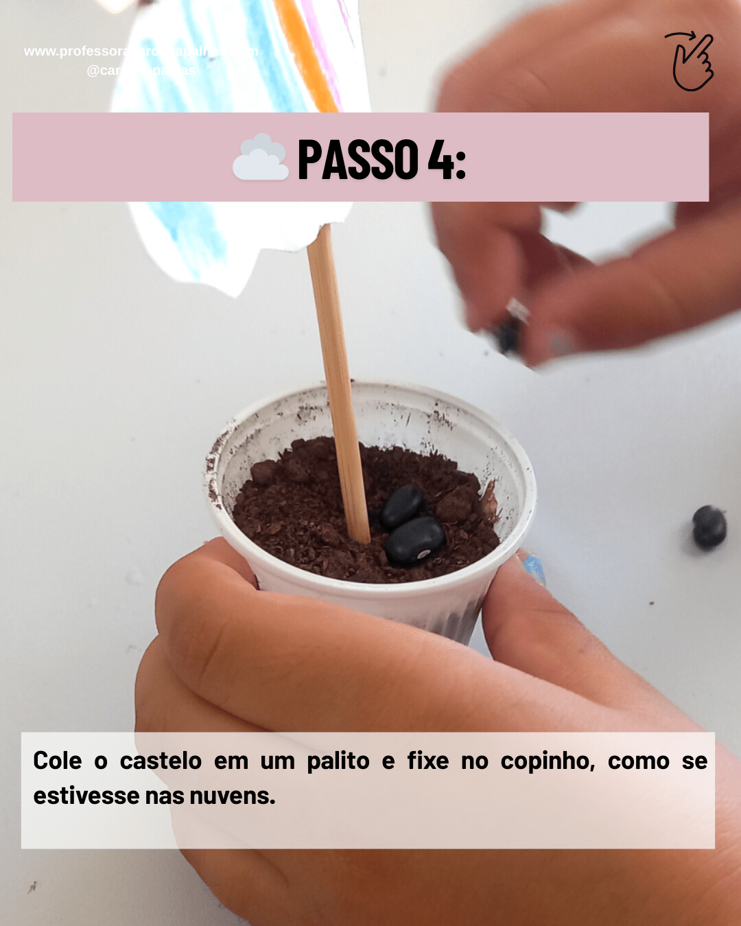 4️⃣ Cole o castelo no palito – O castelo é fixado no copinho, como se estivesse flutuando nas nuvens.
