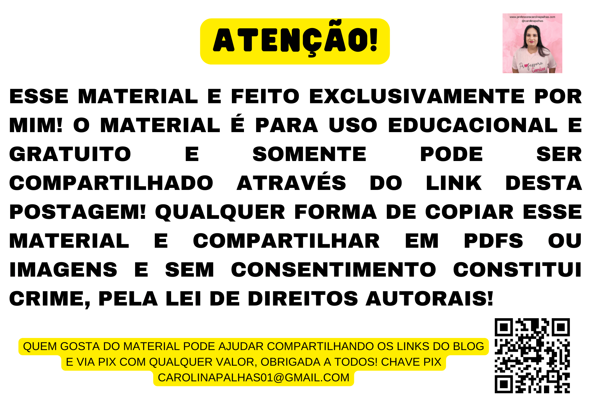 Este material foi produzido exclusivamente por mim. Ele é gratuito e para uso educacional, podendo ser compartilhado apenas através do link desta postagem.