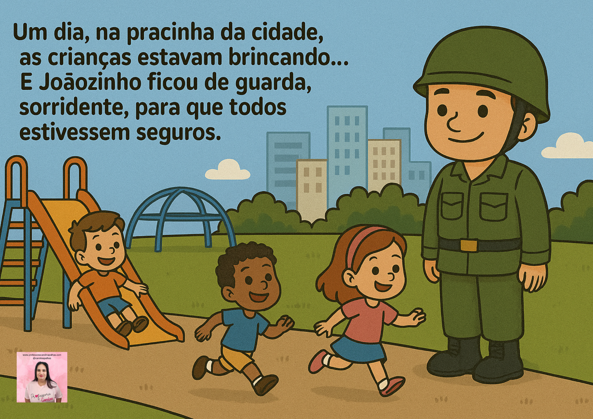 — “O trabalho do soldado é cuidar, proteger e ajudar. Quero que todos brinquem seguros e felizes!”