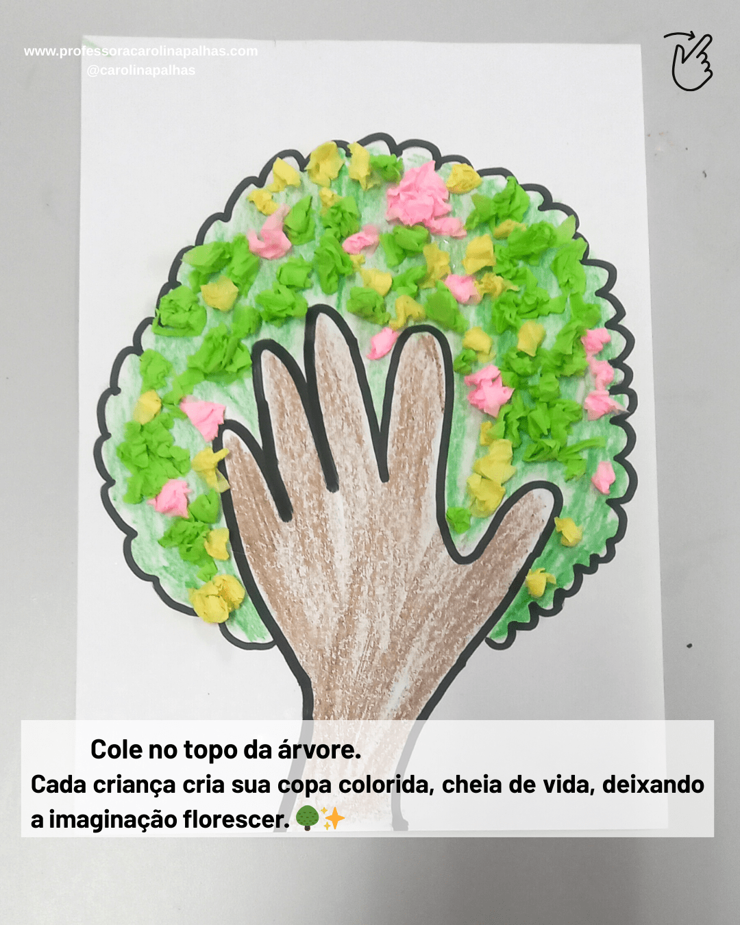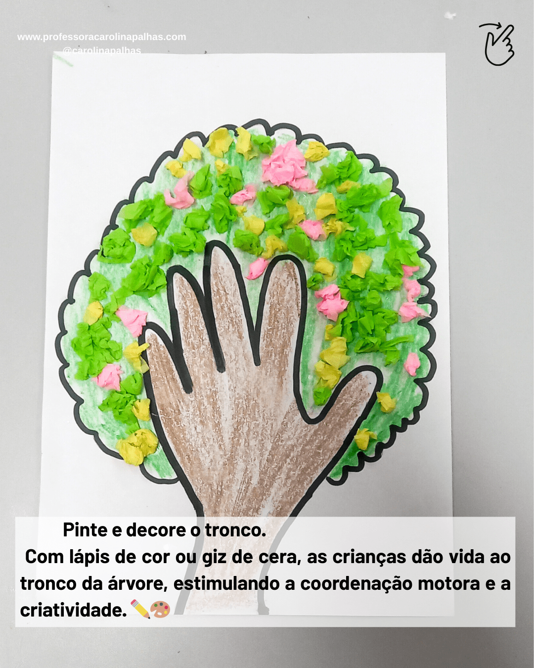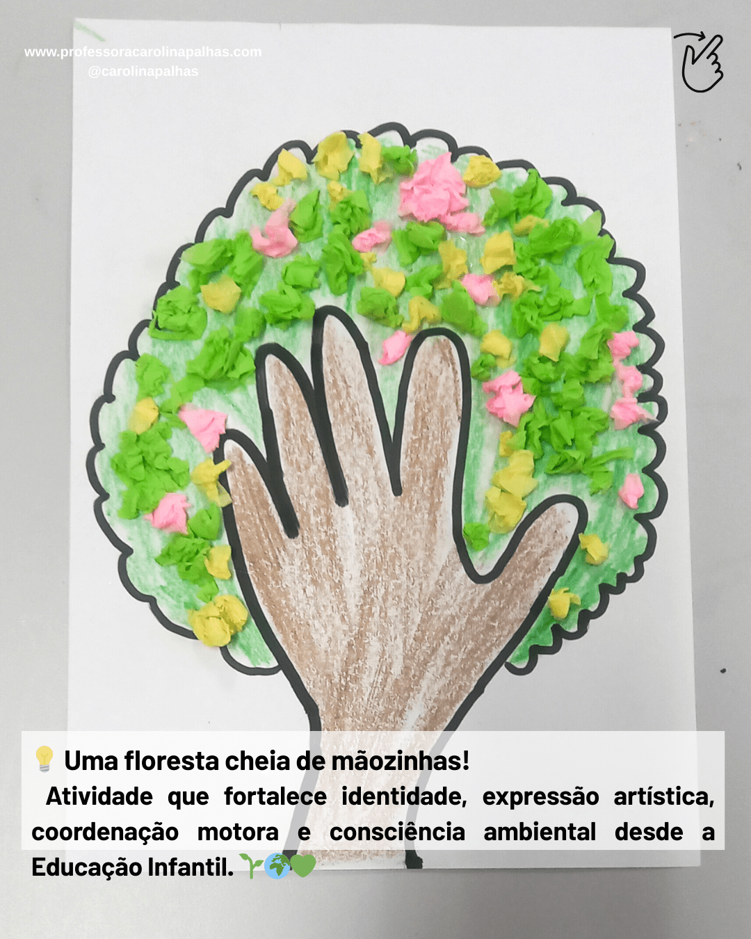 Palavras-chave: árvore da mãozinha, atividade infantil, coordenação motora fina, consciência ambiental, criatividade, educação infantil, atividade pedagógica, arte na infância, BNCC, pedagogia criativa, aprender brincando